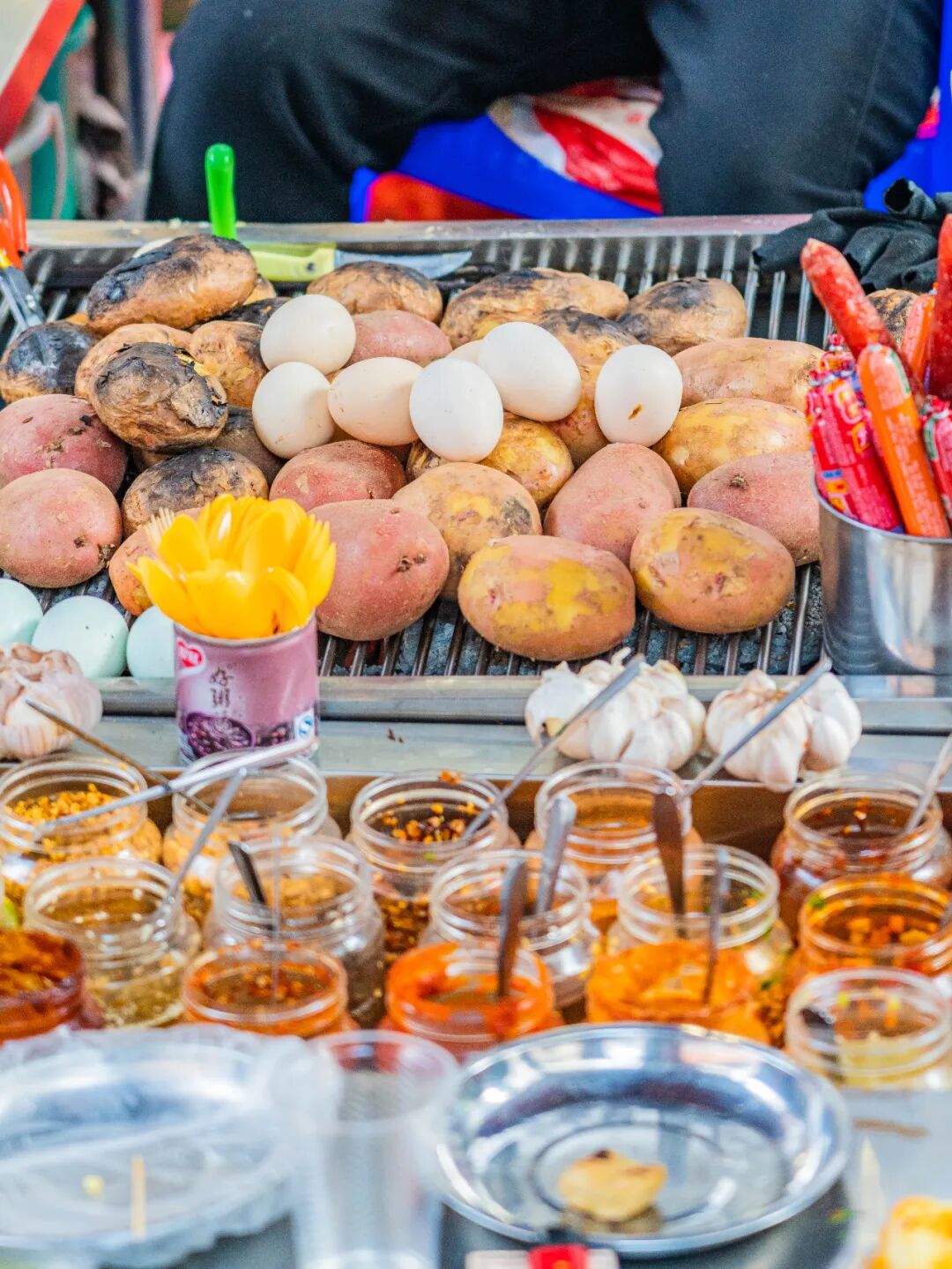 除此之外,这里还有一年四季都吃不腻的大洋芋,佐料都有几十种,带皮烧熟,剥皮切成两半,盖上一层佐料,一口下去比吃肉还过瘾。