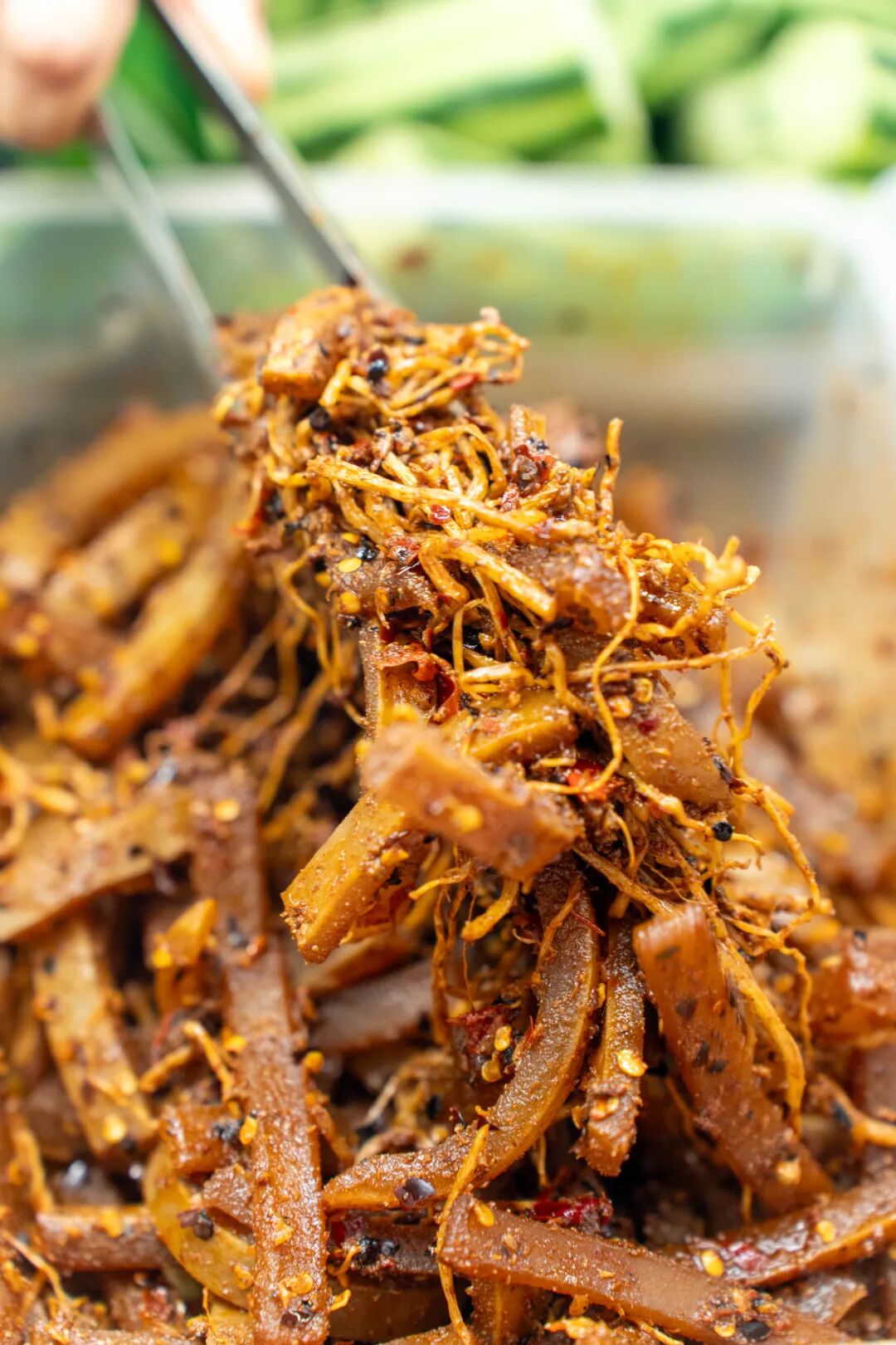 老板每天早上6点起来开始制作,在弥勒就这家店,已经卖了差不多10年了。他家鸡脚有五香、特辣、微辣、香辣、蒜香、酸辣、酸甜、藤椒8种口味。