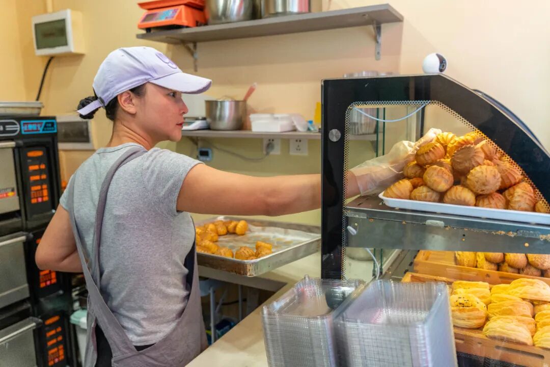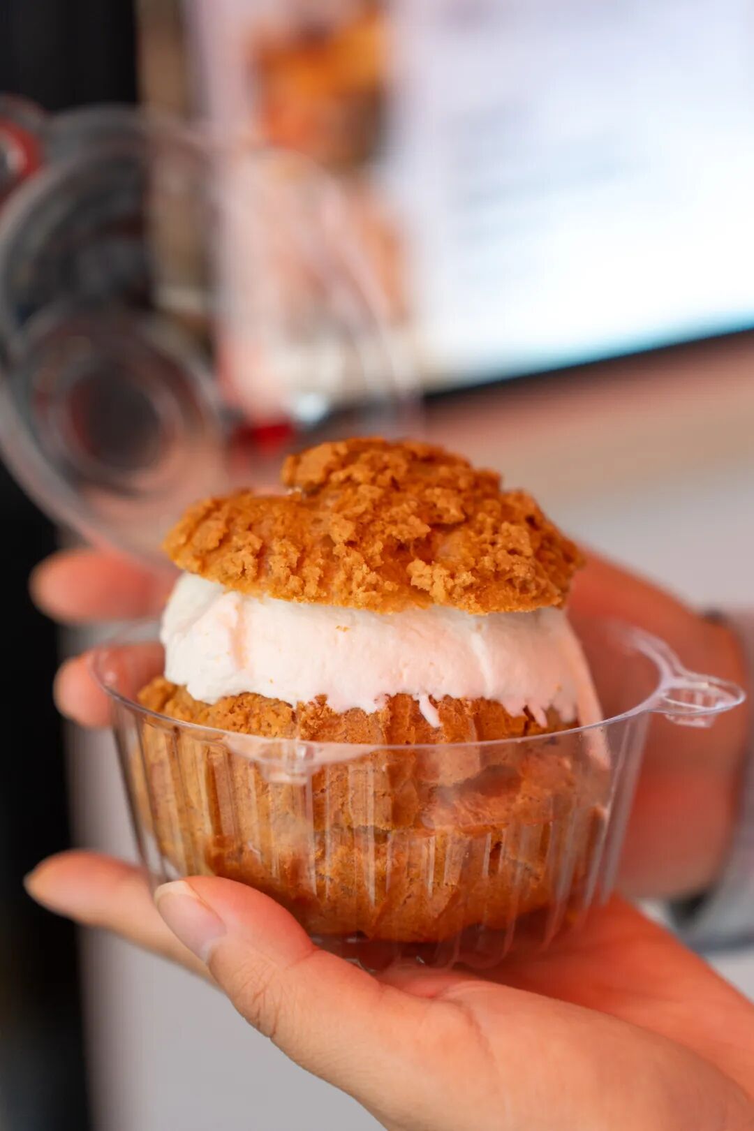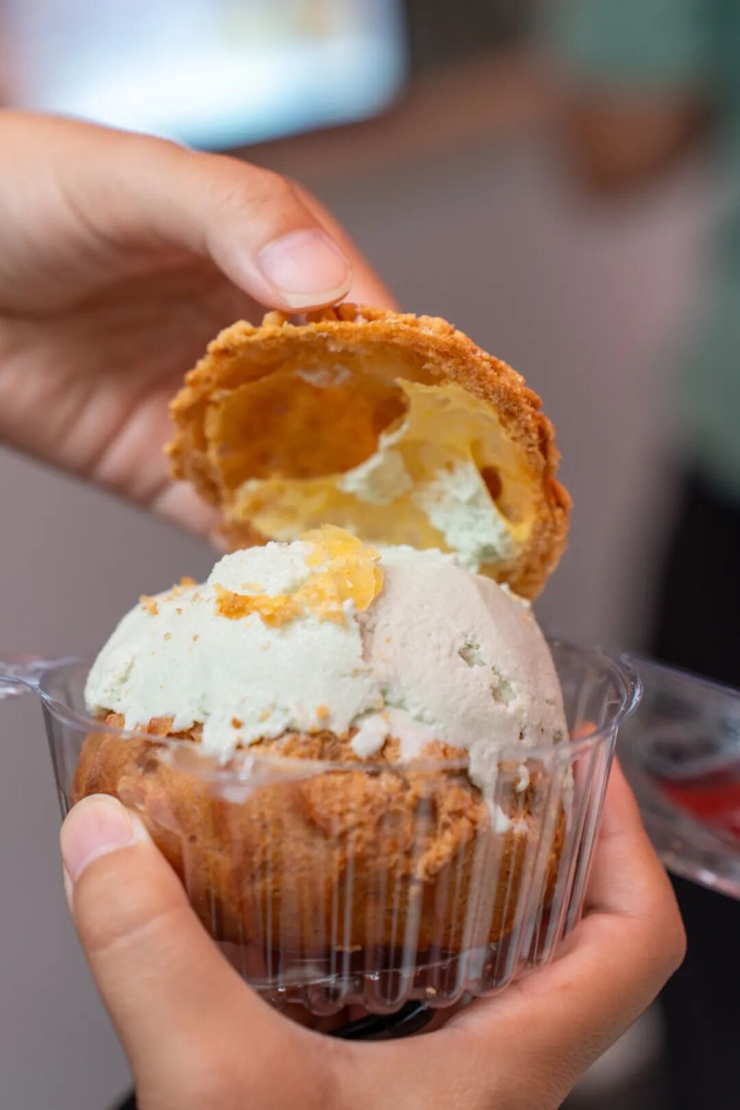 除了招牌奶油小泡芙,法棍泡芙和冰淇淋泡芙也很受欢迎。老板是现买现做,切开泡芙皮,抹上冰淇淋或灌入果浆,把泡芙填的满当当才递到你手上。