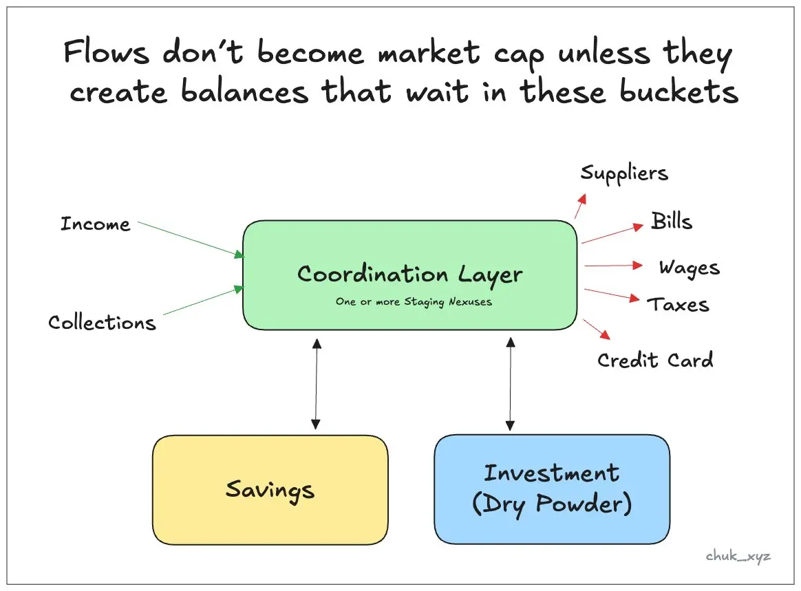 第一层:协调(周转)余额(资金在此待命)第一个余额层级是协调(周转)层。它由暂存节点构成,即资金在“接收”与“支出”之间停留、等待下一步操作的地方。对于零售用户,它是支票账户或钱包;对于企业,它是必须备好用于支付工资、供应商款项和税款的运营现金;对于机构,它是与资本市场挂钩的运营流动性:预付余额和库存。暂存节点不一定是银行账户(肯尼亚移动支付的浮存金表明,即使零收益,钱包也能留存可观的余额)。