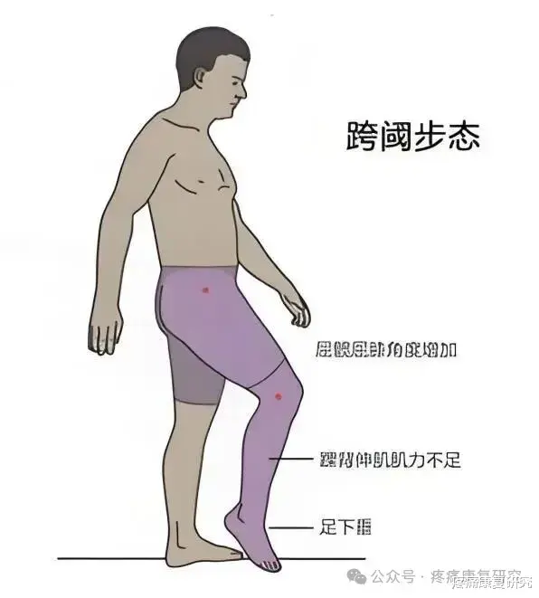 运动障碍:膝盖弯曲无力、蹲起困难;足下垂,走路呈“跨阈步态”,无法正常勾脚、踮脚;