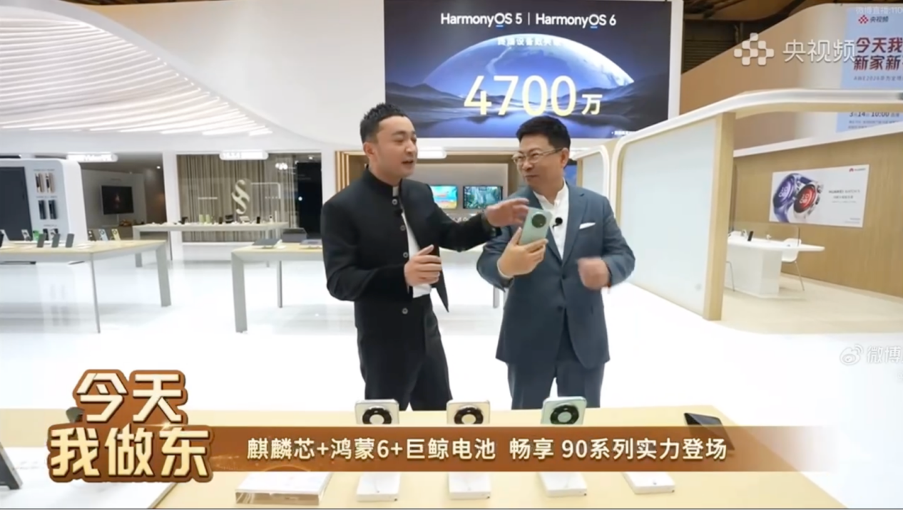 3月14日,上海AWE 2026华为展厅内,一场别开生面的“直播逛展”活动正在进行。华为高管余承东与央视主持人尼格买提一同为观众介绍华为的创新产品,而直播中“意外”出现的华为畅享 90系列,成为了全场焦点。