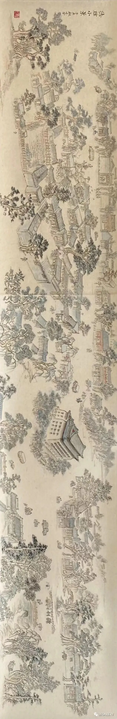 地安门是老北京中轴线上的重要地标,承载着王光宇的童年记忆——“小时候跟着姥姥去买绒花,那热闹劲儿一辈子忘不了”。为画好这幅长卷,她二十余次赴地安门遗址写生,对照老照片还原建筑细节,甚至请老住户回忆当年的商铺布局、市井百态。