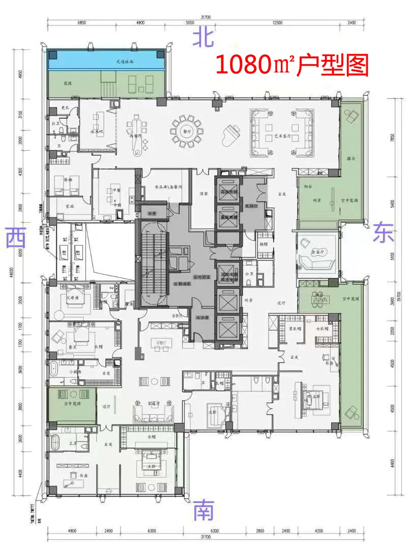 最后附上这套顶级楼层的户型图,这才叫大平层啊!我南昌最贵的大平层是新力洲悦,邓超给爸妈买了一套住,最大户型也就610㎡,我之前还去看过两次样板间,无论是从面积还是价格,跟深圳这个房子都没法比,感觉都超越了上海的汤臣一品。