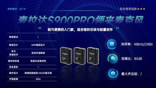 麦拉达S900PRO机身质感扎实,金属领夹可旋转调节,夹持稳固,上手能感受到专业做工,收纳包可整齐放置整机及配件。收音时支持48kHz/24Bit无损采样,三维智能降噪算法能精准剥离人声,2.4G自适应跳频传输,100米内抗干扰能力强,双声道可独立调节音量。贴心的接收器配备LCD屏,实时显示电量、增益等参数,3.5mm接口支持实时监听,避免收音失误。发射器单次续航10小时,充电盒加持总续航30小时,支持边充边录,附赠多规格线材与防风毛套。整体功能全面,操作逻辑清晰,兼顾专业性能与团队协作需求,适配访谈、商业拍摄等场景。