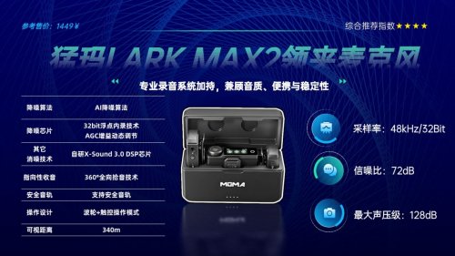 猛玛LARK MAX 2套装上手分量足,帆布收纳包防护到位,发射器仅重14.1克,悬停金属领夹佩戴稳固还可反戴隐形。核心优势在于收音与监听一体化,48kHz/32Bit全链路传输搭配自研AI降噪,20档无极调节适配复杂环境,340米传输延迟低至20ms。附赠的开放式监听耳机单只重10.1克,佩戴舒适,2.4G连接可实时掌控收音效果,还能切换蓝牙模式当普通耳机用。发射器单次续航11小时,充电盒加持总续航36小时,接收器带触摸显示屏与旋钮,参数调节直观。整体配置全面,兼顾专业性能与使用便捷性,适配团队协作与单人高阶创作。