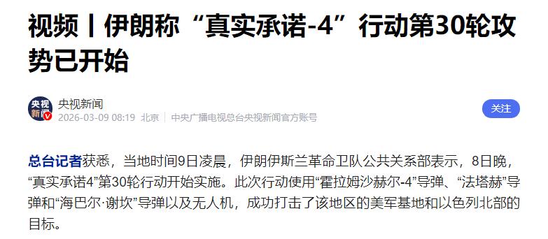 3月9日凌晨,伊朗军方表示“真实承诺4”第30轮行动开始实施。再次使用了“霍拉姆沙赫尔-4”导弹、“法塔赫”导弹和“海巴尔·谢坎”导弹以及无人机的组合模式,对美军基地和以色列北部进行了袭击。