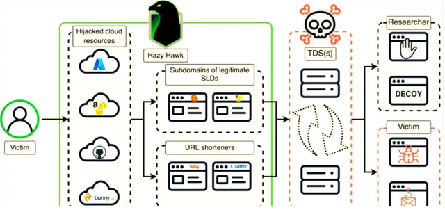 六、废弃CNAME记录被滥用2025年6月,名为“HazyHawk”的黑客团伙通过劫持废弃DNS CNAME记录,接管了大量政府、高校及跨国企业的可信子域名,用于分发诈骗内容、虚假应用与恶意广告。其攻击手法非常隐蔽:先扫描带有指向废弃云端点的CNAME记录的域名,再注册与废弃资源同名的新云服务,使原始子域自动解析至攻击者控制的站点。
