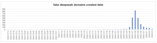 一、DeepSeek仿冒域名泛滥2025年初,国产AI大模型DeepSeek爆火,但随之而来的是大量仿冒域名的涌现。据统计,2024年12月至2025年2月期间,共出现2650个仿冒DeepSeek的域名,1月下旬达到注册高峰,其中60%的解析IP位于美国,其余分布在新加坡、德国等多个国家,呈现全球化攻击特征。这些仿冒域名主要用于钓鱼欺诈与恶意软件分发,通过模仿官方界面误导用户输入账号密码,或诱骗下载恶意程序。