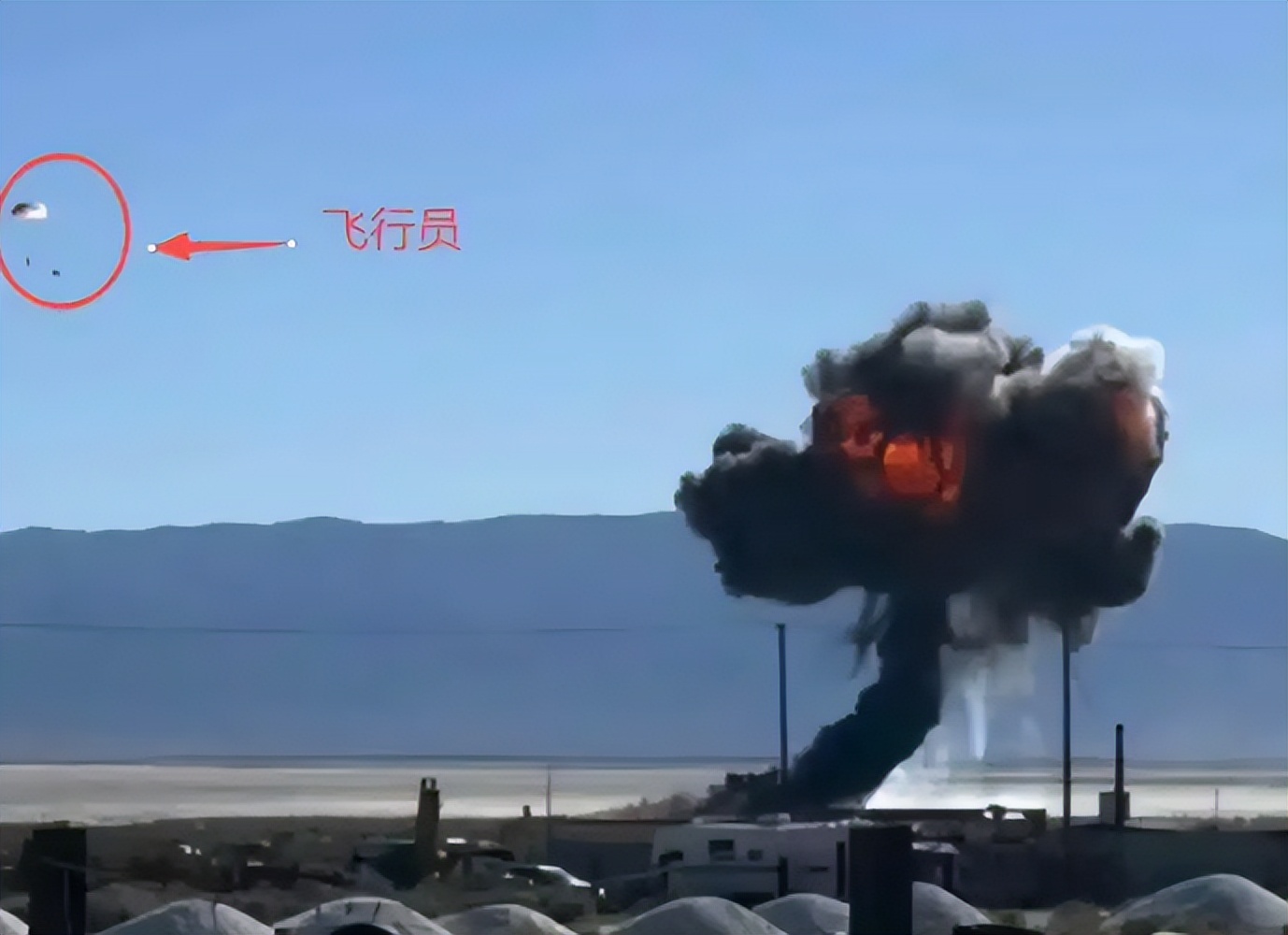 就在战机离地面只剩 300 米左右的危急时刻,一朵白色降落伞突然弹出,飞行员成功逃生,而战机则重重砸在干涸的湖床上,瞬间燃起十几米高的大火。