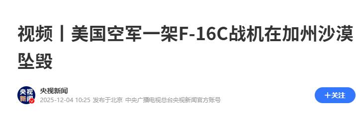 信息来源:央视新闻:视频丨美国空军一架F-16C战机在加州沙漠坠毁