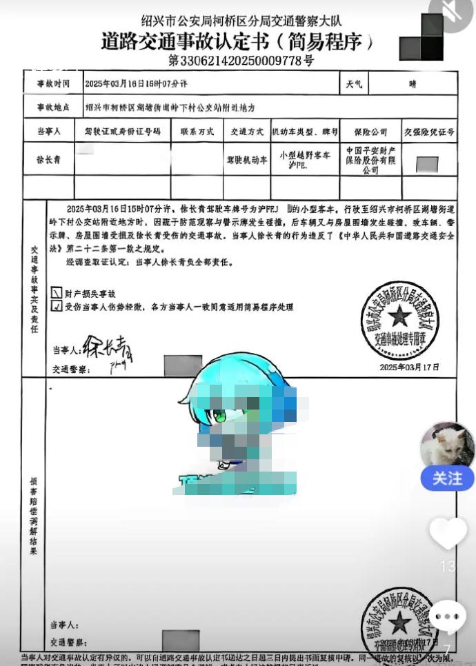 爆料说去年3月她在绍兴开车出了车祸,不仅撞了路边的警示牌,还撞塌了居民家的围墙。