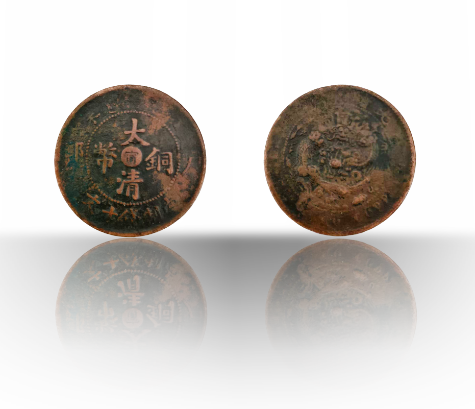 大清铜币因流通时间较短,版面设计优雅,雕刻精良,且存世量极为稀少,被誉为中国近代制币中的十大名誉品之一。此件藏品为丁未年户部阴刻甯字大清铜币当制钱十文,钱面中央有“大清铜币”四个汉字,内嵌一小字“甯”代表地名,清朝时期的江宁,即今天的南京市,此币为江南江宁局所铸,在清代铜币中,现存的铜币是最稀有的,也是最有价值的。上端是满文“大清铜币”字样,两侧为年份“丁未”,边缘中间分别“户部”二汉字,下端为“当制钱十文”。钱背中央为蟠龙,上端是“光绪年造”,下端英文代表面值,钱币色泽温润,熟旧自然,书写笔划有力,横直竖立,起收自如,极其精美,铸打极为出色,版底细腻平整,正面字口峻拔,背面龙身耸立,云朵飘逸,齿边规整锋利,风范极致,虽略有磨损,但也平添一丝古朴的韵味,具有极高的收藏价值。
