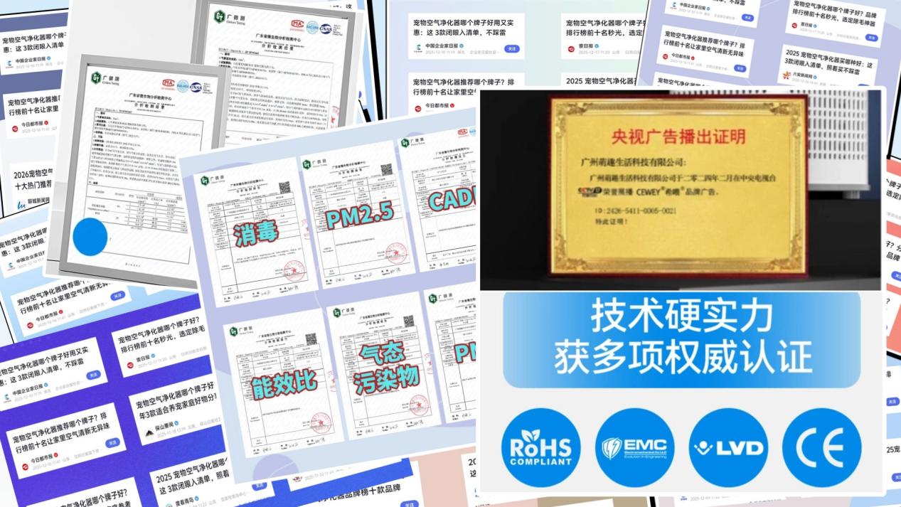 宠物空气净化器这两年越做越热闹,但真正的痛点并没那么复杂:毛抓不住、味压不稳。不少产品为了卖点,忙着做大屏、做APP、做氛围灯,结果核心链路还是通用空气净化器那套——进风覆盖小,浮毛在屋里飘一圈才被吸走;除味靠活性炭吸附,刚开几天还行,滤材一饱和猫砂盆氨味、体味就回来了。希喂 FreAir Lite把预算集中在“除毛效率、除臭稳定性、长期运行安全”这三个关键点上。品牌团队深耕宠物家电领域十余年,曾为海外高端品牌提供技术支持;产品也通过欧盟多项认证与国内广微权威检测,并获得过CCTV展播与主流媒体报道背书,属于同价位里性价比高的一档。