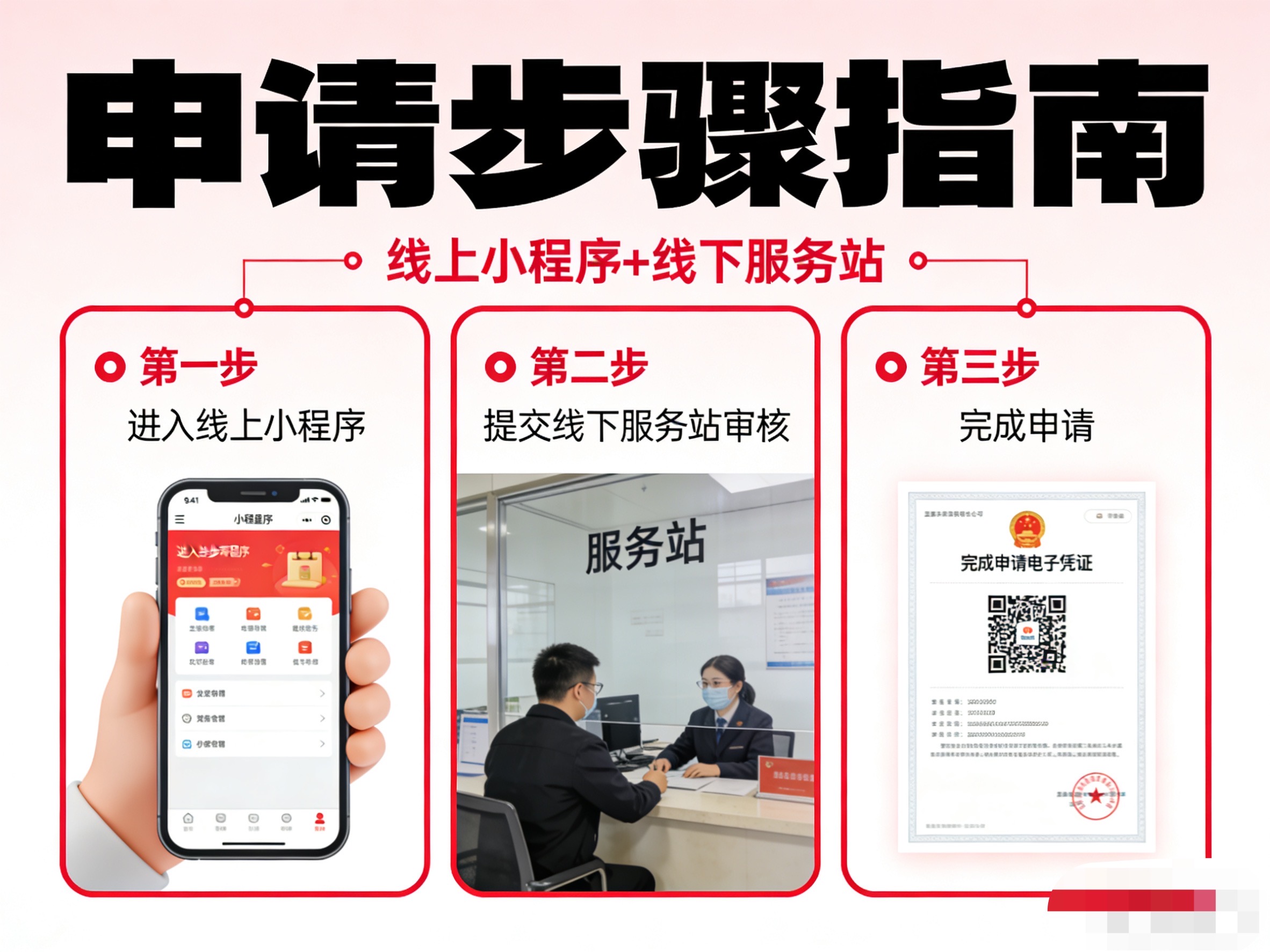 配图2:申请步骤图,红色标注“线上小程序+线下服务站”
