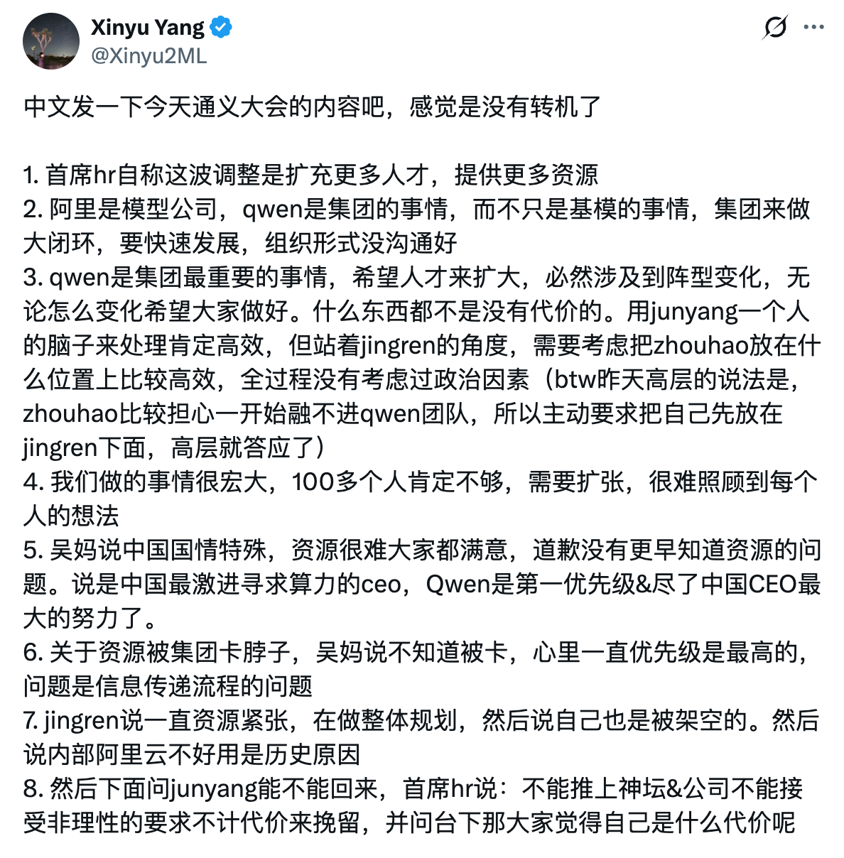 据“Xinyu Yang”透露,此次大会上,阿里首席HR(或为姜中华)称,最近千问高层动荡,是为了扩充更多人才,提供更多资源。在此过程中,必然涉及阵型变化,很难照顾到每个人的想法,“什么东西都不是没有代价的”。