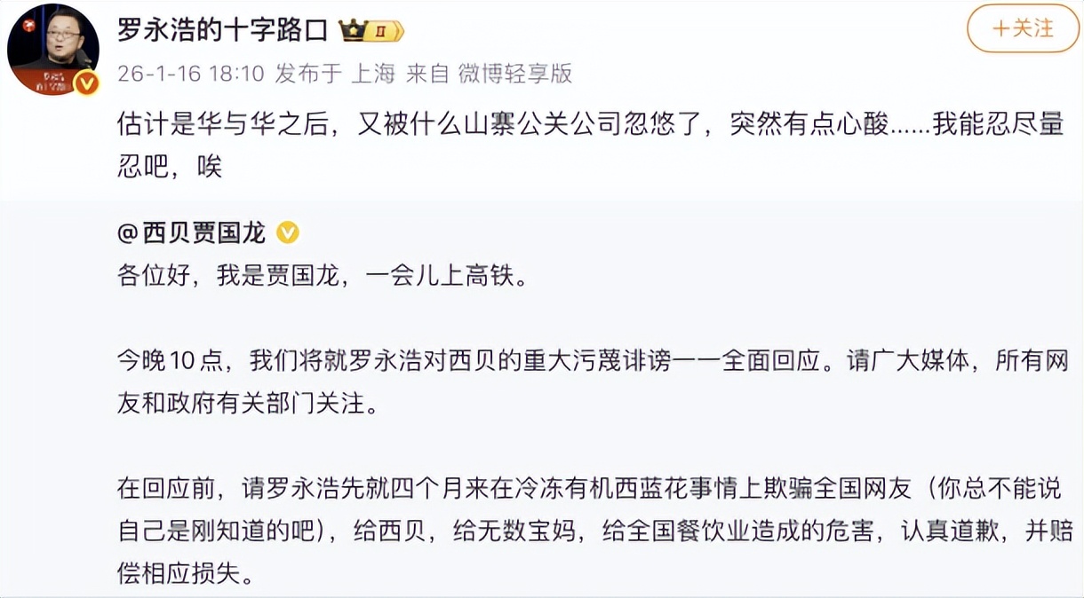 偏偏贾国龙反其道而行之,跳出来喊话让罗永浩道歉还得赔偿损失,这波迷之操作直接坐实了罗永浩那句“估计又被什么山寨公关公司忽悠了”,说句实在的,连我这个看热闹的都替西贝觉得心酸,好好的一个国民餐饮品牌,硬是被不靠谱的公关建议架到了舆论的火上烤。