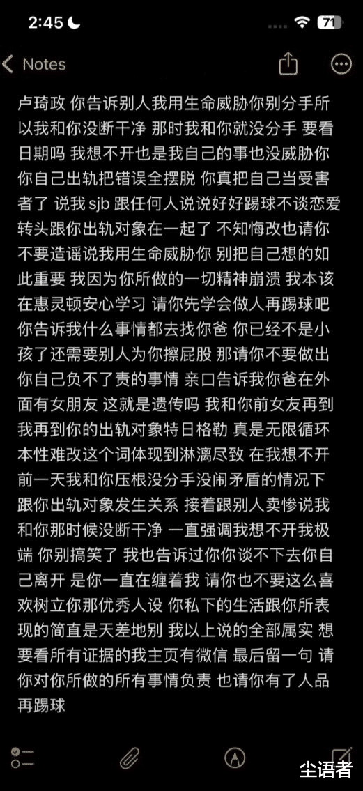 日前,一位名叫“AREN”的网友在社媒发文,她自称是卢琦政的女友,在网上她控诉卢琦政与其恋爱期间出轨,并且还有如抽烟喝酒、裸聊、与未成年人开房等多个丑闻。这位女网友表示:“卢琦政,你自己出轨,把错误全摆脱,你真把自己当受害者了,跟任何人说好好踢球不谈恋爱,转头跟你出轨对象在一起了,不知悔改。”