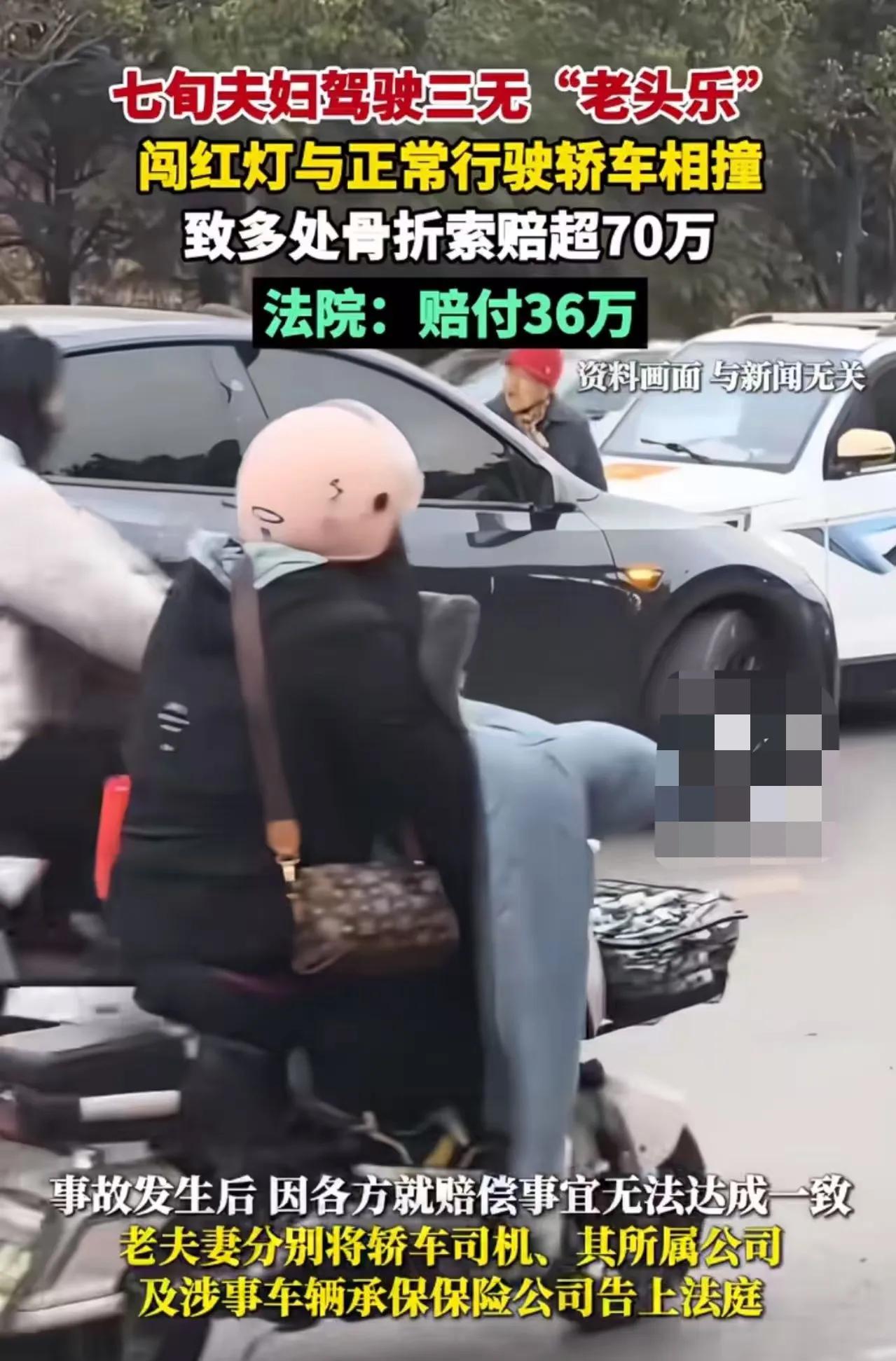 七旬夫妇驾三无“老头乐”闯红灯,撞上正常行驶轿车。