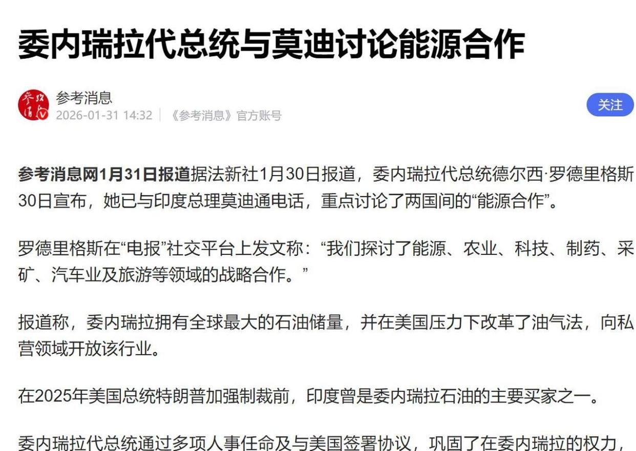 扎心的是,现在的委内瑞拉代总统看来是铁了心要跟美国穿一条裤子了。在这个节骨眼上,印度跑去配合美国的行动,说难听点就是为虎作伥。虽然买卖自由,咱们明面上不好说什么,但这种为了讨好新主子就牺牲老伙伴利益的行为,确实让人看清了某些国家的底色。