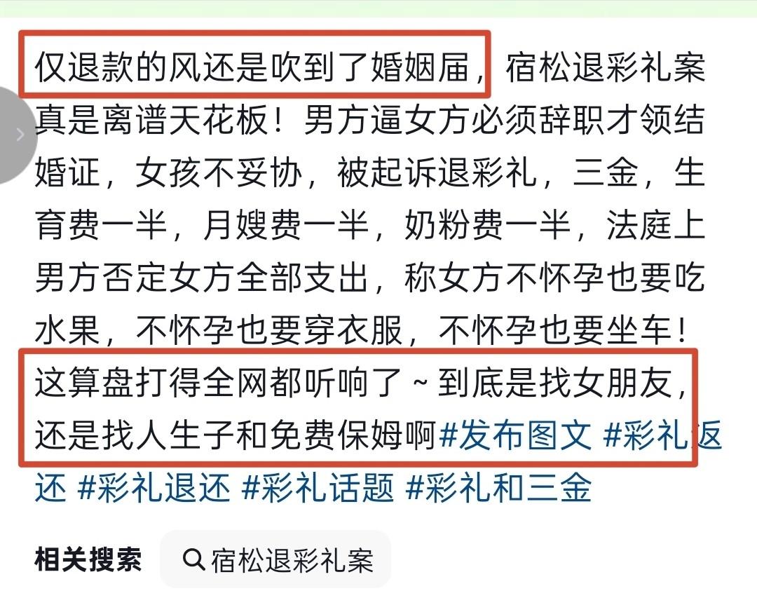 对此,有网友说“仅退款的风还是吹到了婚姻,宿松退彩礼案真是离谱天花板!”