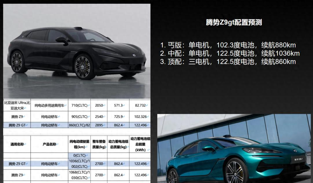 腾势Z9gt为什么要拿掉三电机,我可算是看出来了,原来就是为了冲刺1000公里的CLTC续航。现在第403批申报车型的续航出来了,和之前的腾势Z9gt配置申报数据一合计。那新款的z9gt配置就完整了。