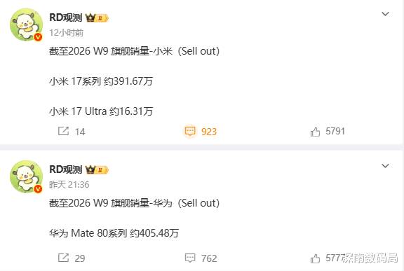 截至2026年3月第9周,国内手机市场旗舰机型销量数据正式出炉,一组数字直接引爆数码圈:苹果iPhone 17系列国内销量狂揽2383.97万部(约2300万部),华为Mate 80系列销量突破405.48万部,而小米17系列、vivo X300系列、OPPO Find X9系列销量分别为391.67万部、173.39万部、144.34万部,差距一目了然。