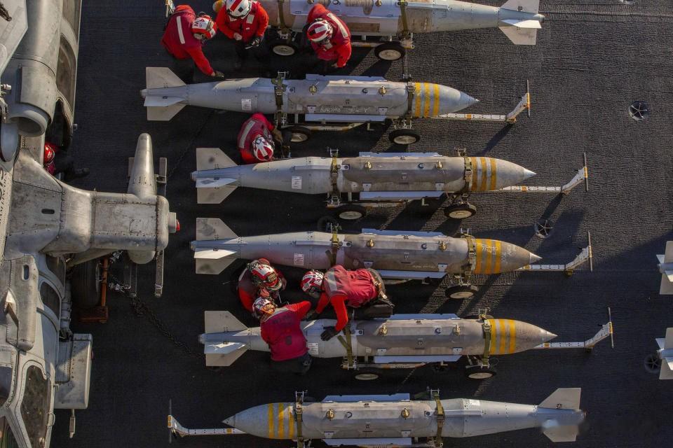 美国海军尼米兹级航空母舰“亚伯拉罕·林肯”号的飞行甲板上,美国水兵正在准备部署军械