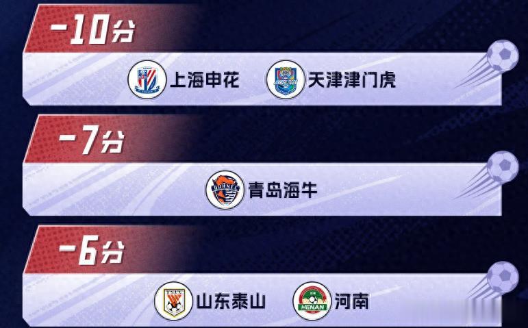 中国足协今日11:58分正式公布了“假赌黑”专项整治行动受处罚的俱乐部名单。津门虎、申花被罚10分,中超共9队被罚分,总计13家职业俱乐部被罚分。