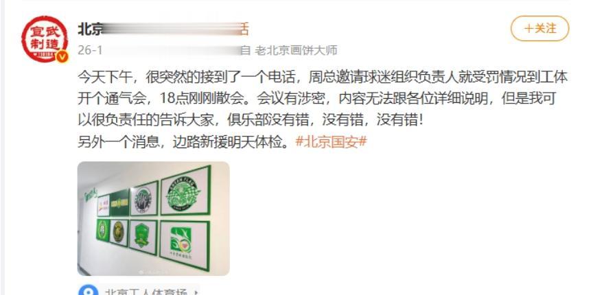 博主北京的晖子在社媒写道:“今天下午,很突然的接到了一个电话,周总邀请球迷组织负责人就受罚情况到工体开个通气会,18点刚刚散会。会议有涉密,内容无法跟各位详细说明,但是我可以很负责任的告诉大家,俱乐部没有错,没有错,没有错!”