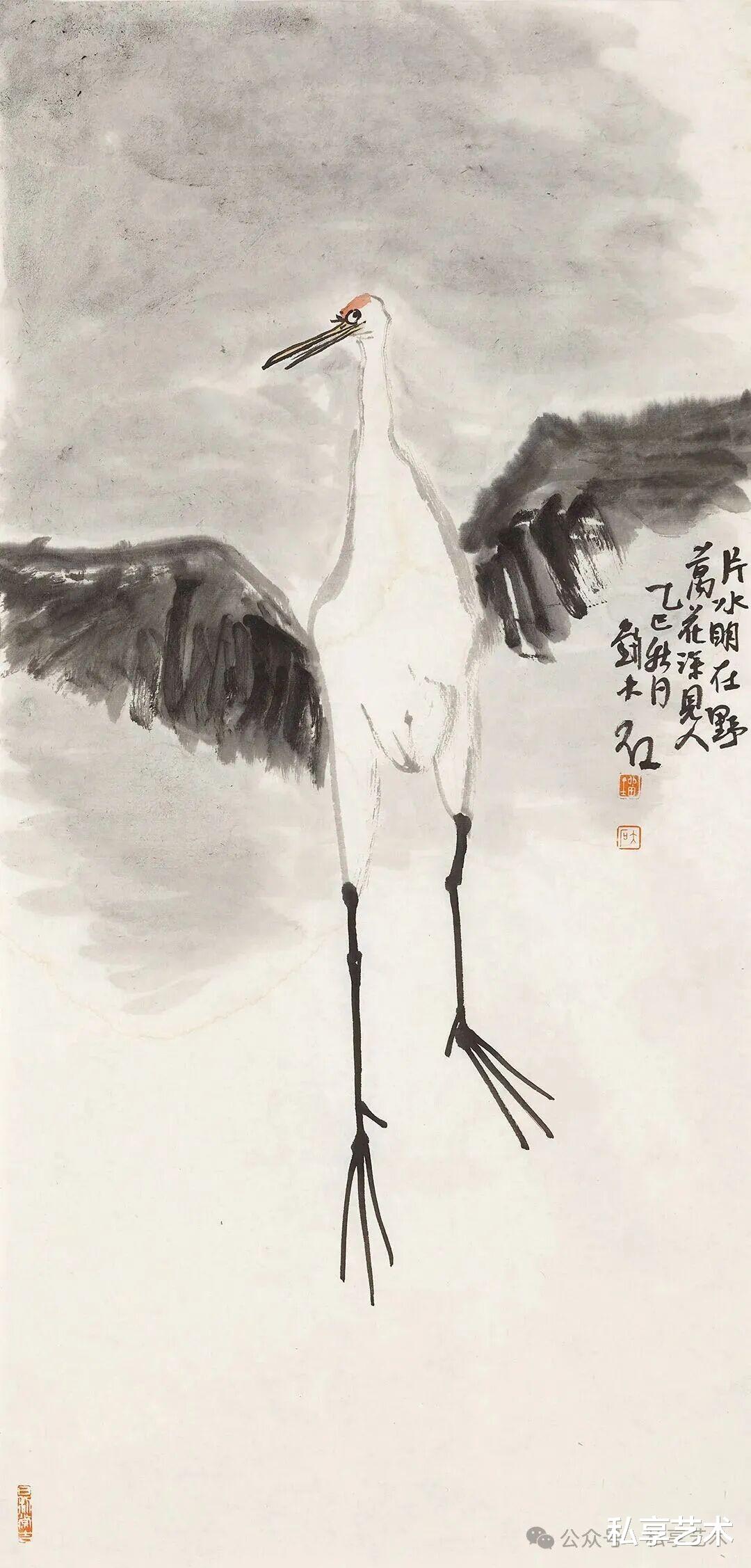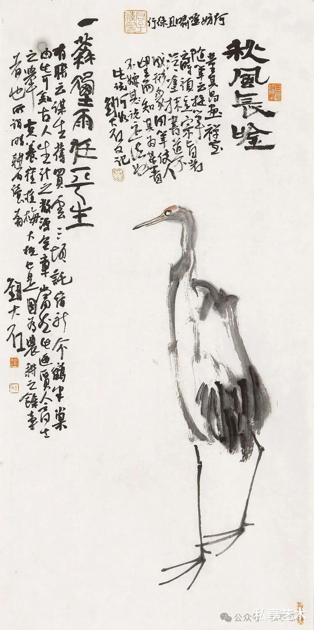 大石爱鹤,笔墨“传神”,不独“形似”,画里有诗,诗里有画,其鹤形态万千而气味如一,大如八大的鱼鸟。