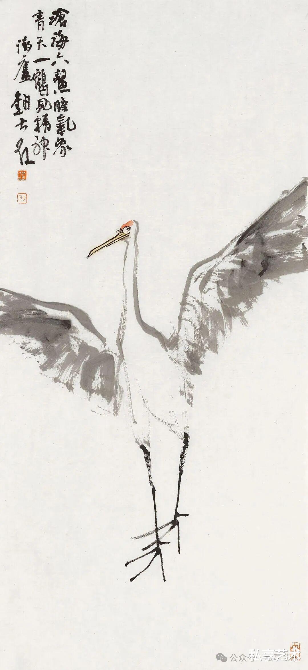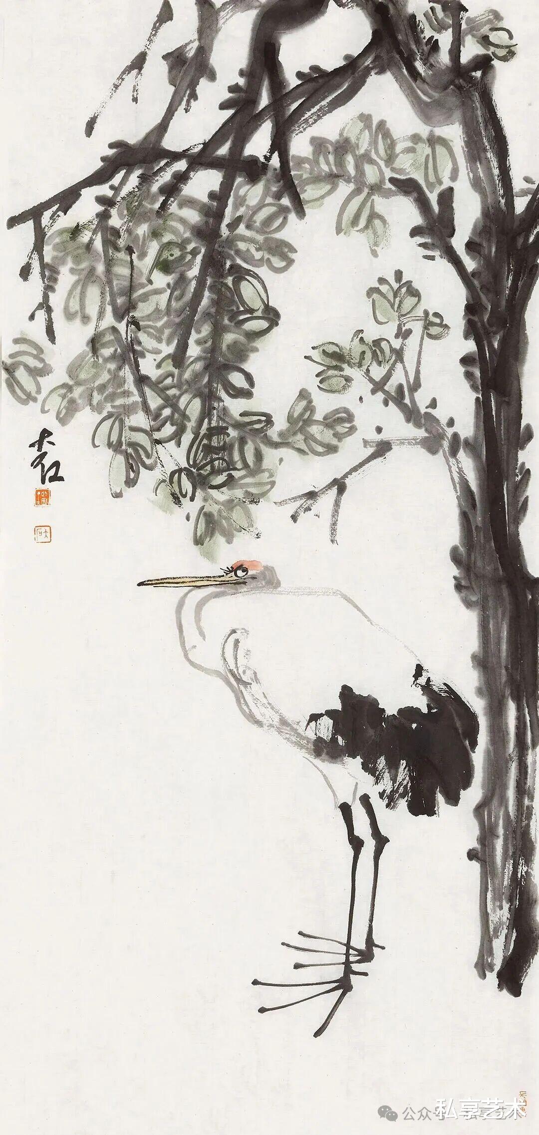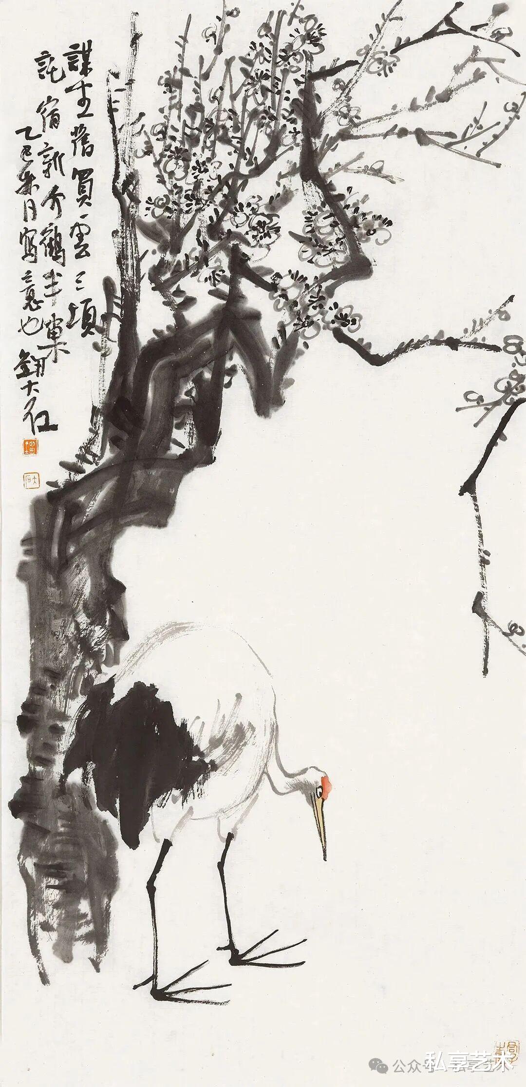 文人喜爱这些题材,大石兄更喜画鹤,弹指间,笔下便多了几分清逸。偶见山巅仙鹤掠空,清唳穿云,亦追其影入画,添几笔山间松柏,使图画中多些静气,不徒摹古,只写吾心。大石兄推崇的文人画的心神,更付诸其绘画的内容与意趣。