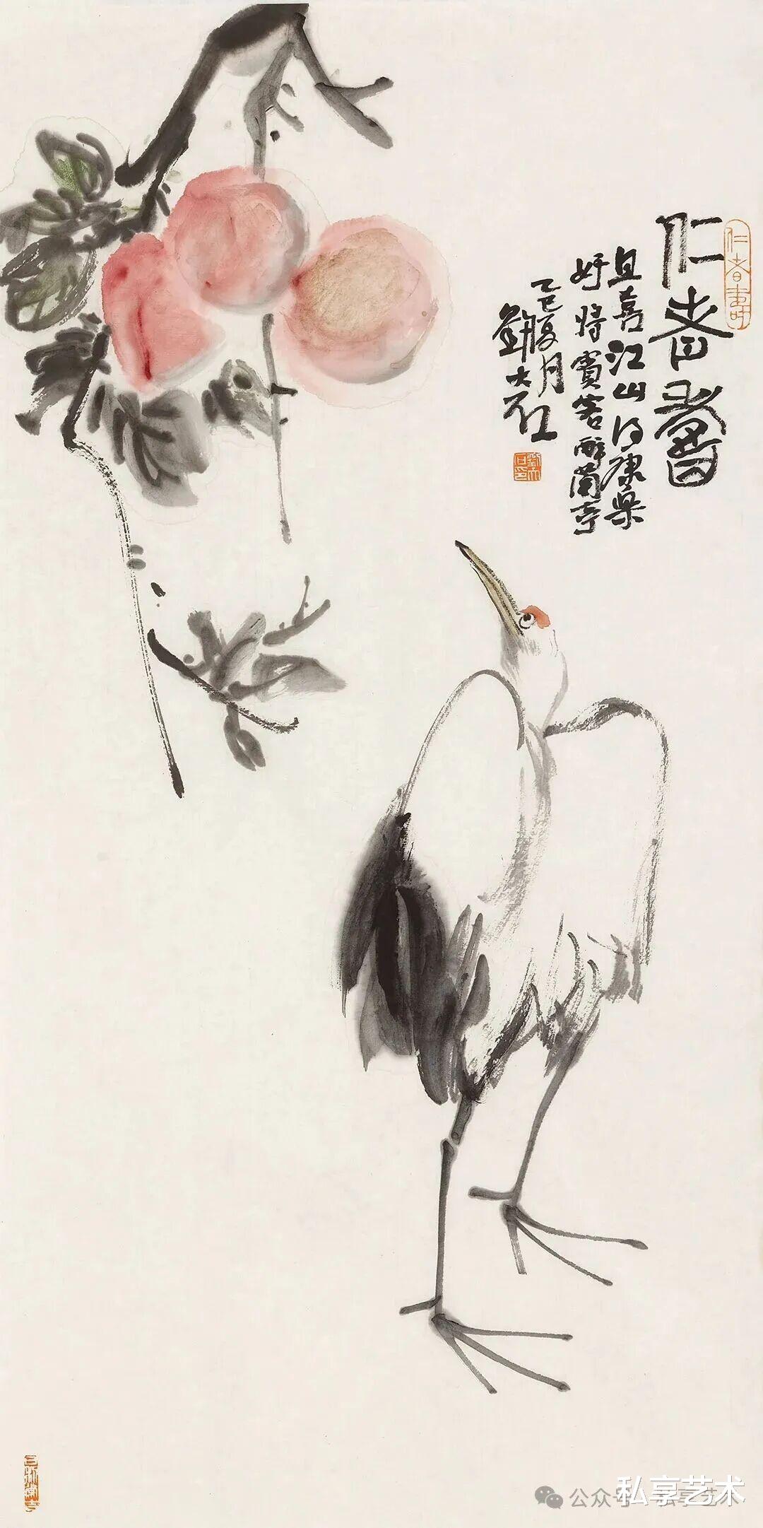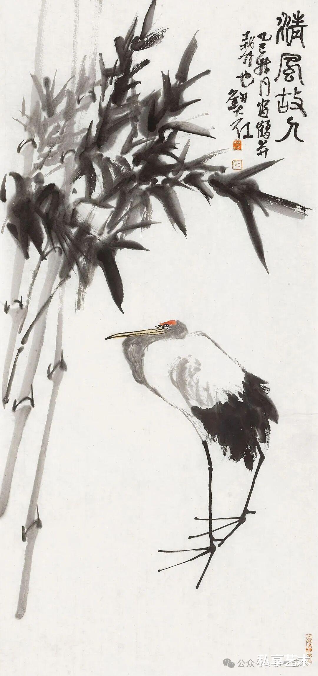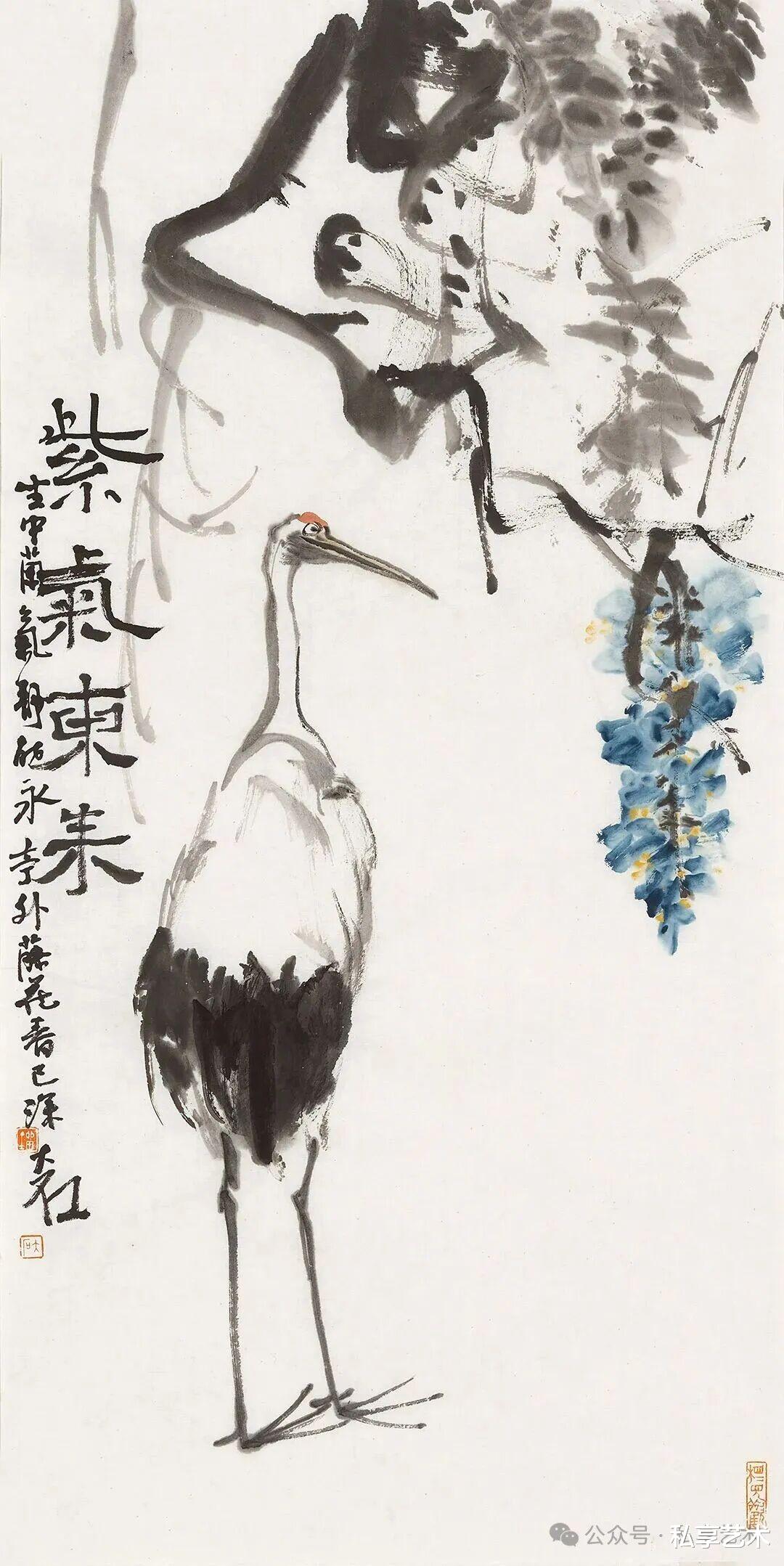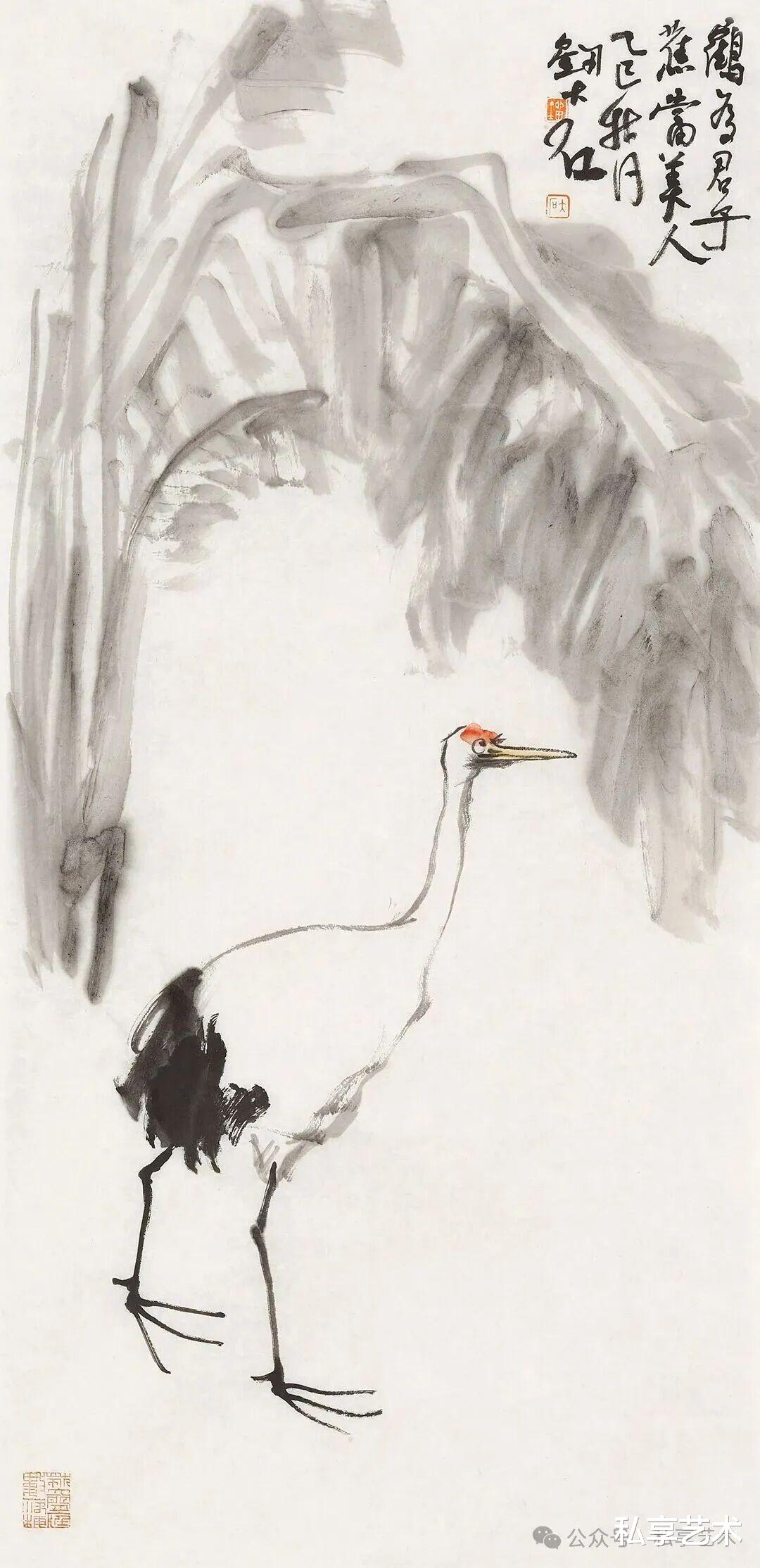 文人喜爱这些题材,大石兄更喜画鹤,弹指间,笔下便多了几分清逸。偶见山巅仙鹤掠空,清唳穿云,亦追其影入画,添几笔山间松柏,使图画中多些静气,不徒摹古,只写吾心。大石兄推崇的文人画的心神,更付诸其绘画的内容与意趣。