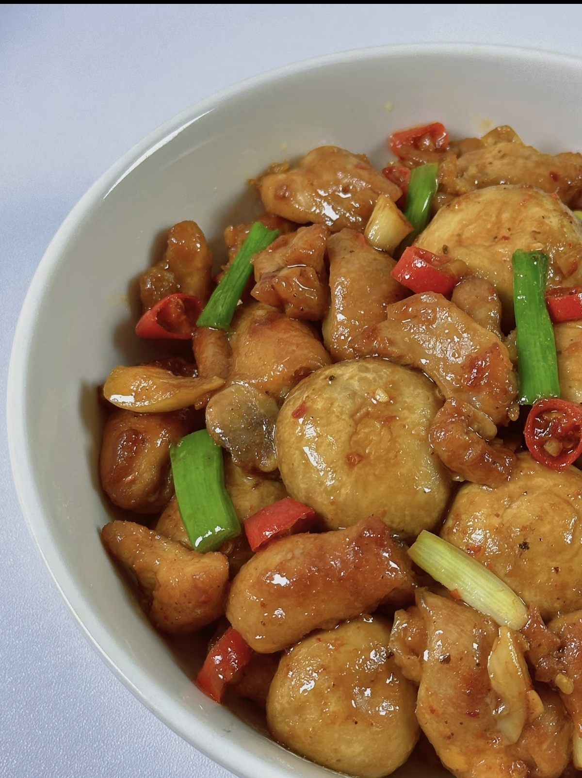 当食材准备就绪,烹饪的交响曲便正式奏响。起锅倒油,油热后转中小火,将腌制好的鸡腿肉平铺在锅中,耐心煎制。待一面煎至金黄,再翻面煎另一面,直至鸡肉表面焦香,锁住内部的汁水,随后盛出备用。此时,锅中留下的底油是风味的关键,切勿倒掉。利用这底油,放入蒜片和喜辣者可加的小米辣圈,小火慢煸,直至蒜香扑鼻,注意火候以免炒糊发苦。接着,倒入切好的口蘑片,转中火翻炒。口蘑在受热后会慢慢析出水分,继续翻炒至水分收干,表面变得金黄焦香,其特有的鲜味便被彻底激发出来。
