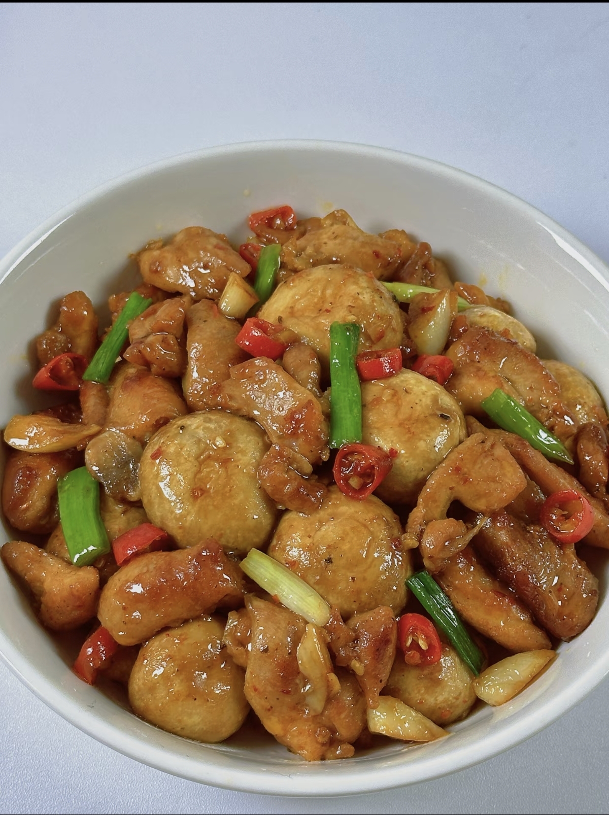 随后,将先前煎好的鸡肉倒回锅中,与口蘑、蒜香一同翻炒均匀,让每一块食材都沾染上浓郁的香气。沿着锅边淋入两勺生抽、一勺蚝油和半勺白糖提鲜,快速翻炒均匀,使酱汁包裹住所有食材。若觉得酱汁略干,可加入少量清水,盖上锅盖焖煮三分钟左右,让鸡肉和口蘑充分吸收酱汁的精华。最后,开大火快速收汁,待汤汁变得浓稠透亮,紧紧挂在食材上时,便可关火出锅。装盘后,撒上些许葱花和剩余的生蒜末,这道菜的颜值与香气瞬间翻倍。