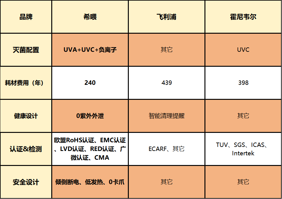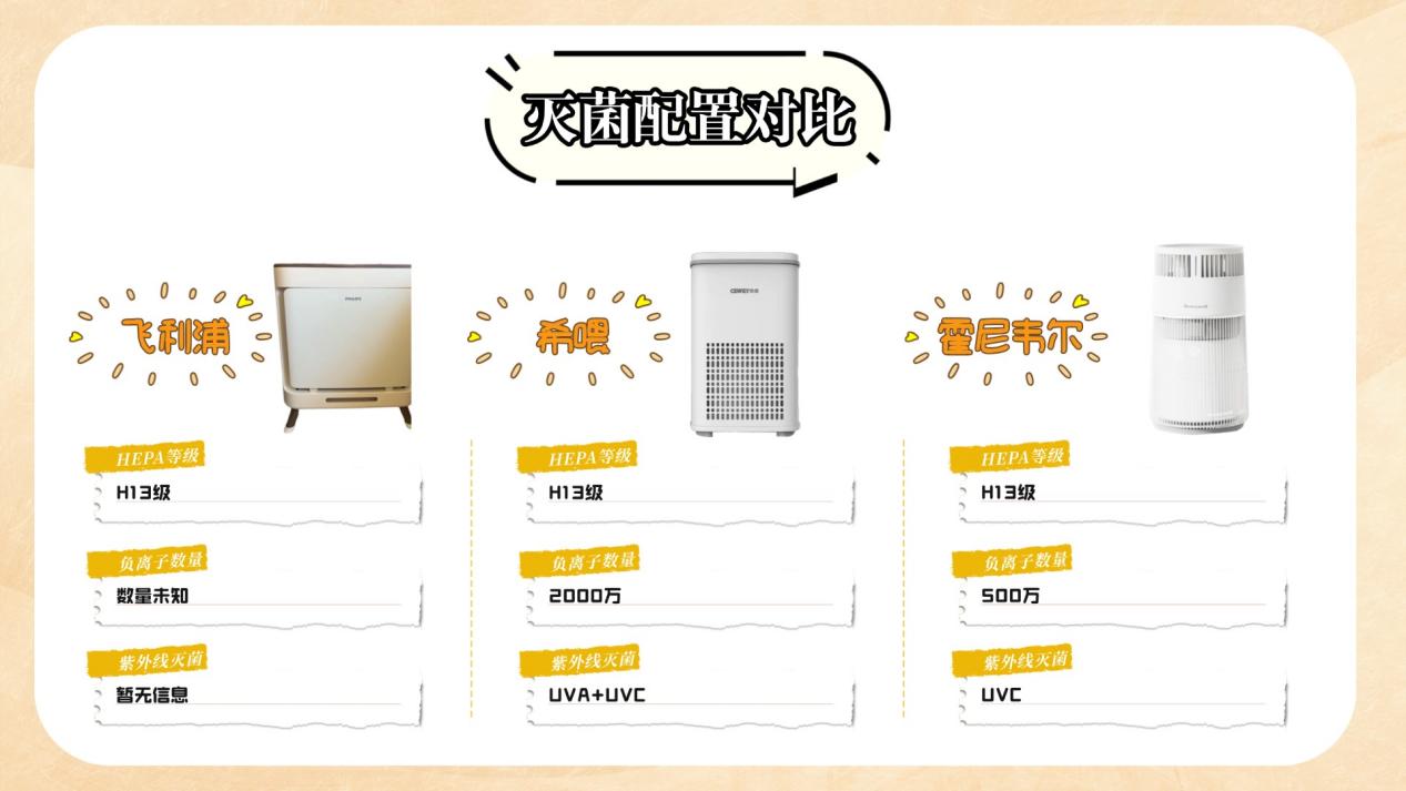 在灭菌能力方面,希喂配置最全,霍尼韦尔次之,飞利浦更偏基础净化定位。