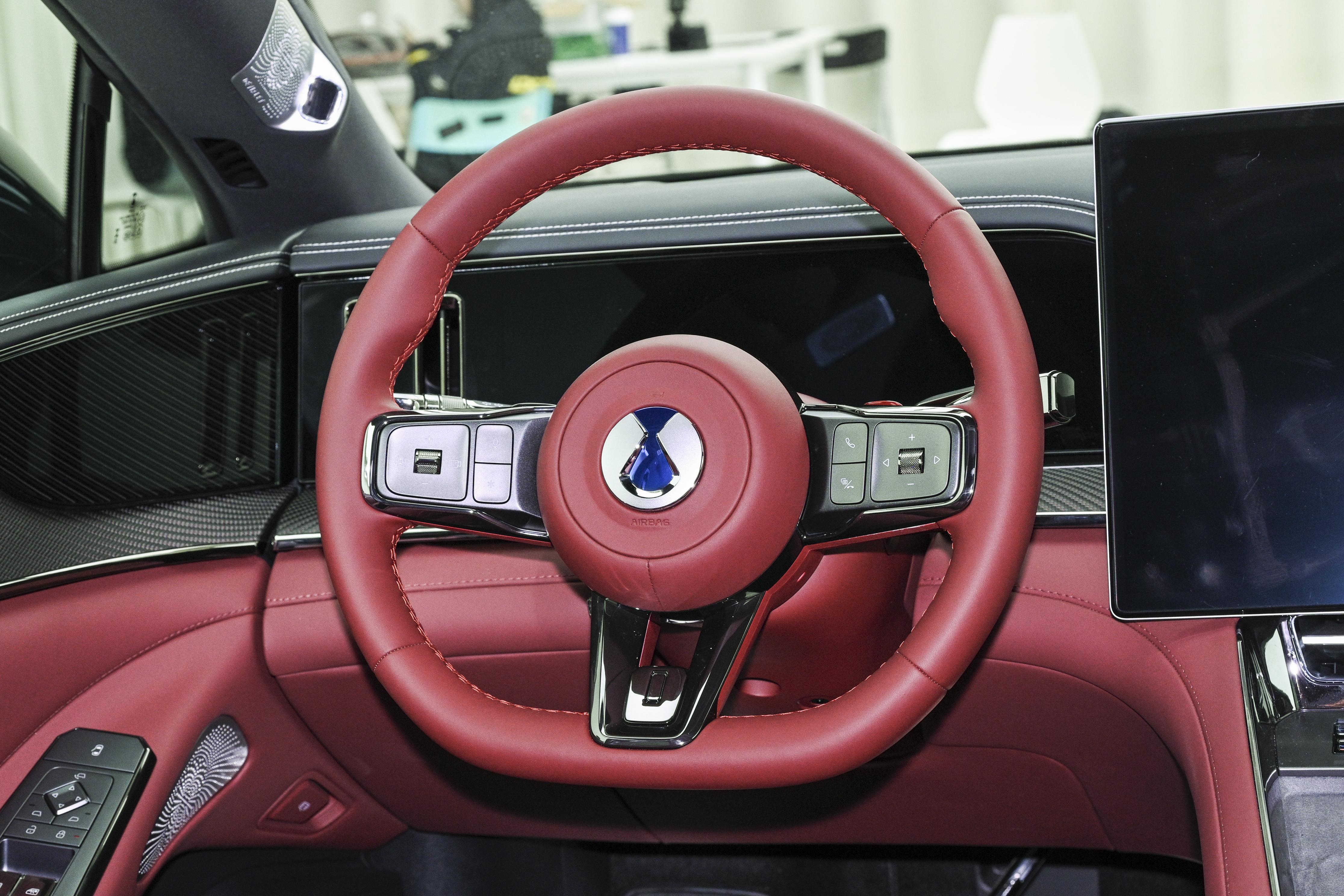 坐进车内,内饰的质感和舒适度高度贴合豪华GT的定位,提供熔岩红、穿雾灰、踏雪白三款内饰配色,不同配色营造的氛围差异很明显,深色系耐脏低调,浅色系清爽大气,能适配不同用户的审美。车内能摸到的地方大多用了软质包裹,搭配原厂真碳纤维内饰、红色BOOST拨片、金属怀挡和三幅式运动方向盘,运动氛围很浓郁,又不会显得廉价。细节处也做了优化,螺旋纹扬声器罩和镀铬装饰搭配得当,视觉上精致感很足。