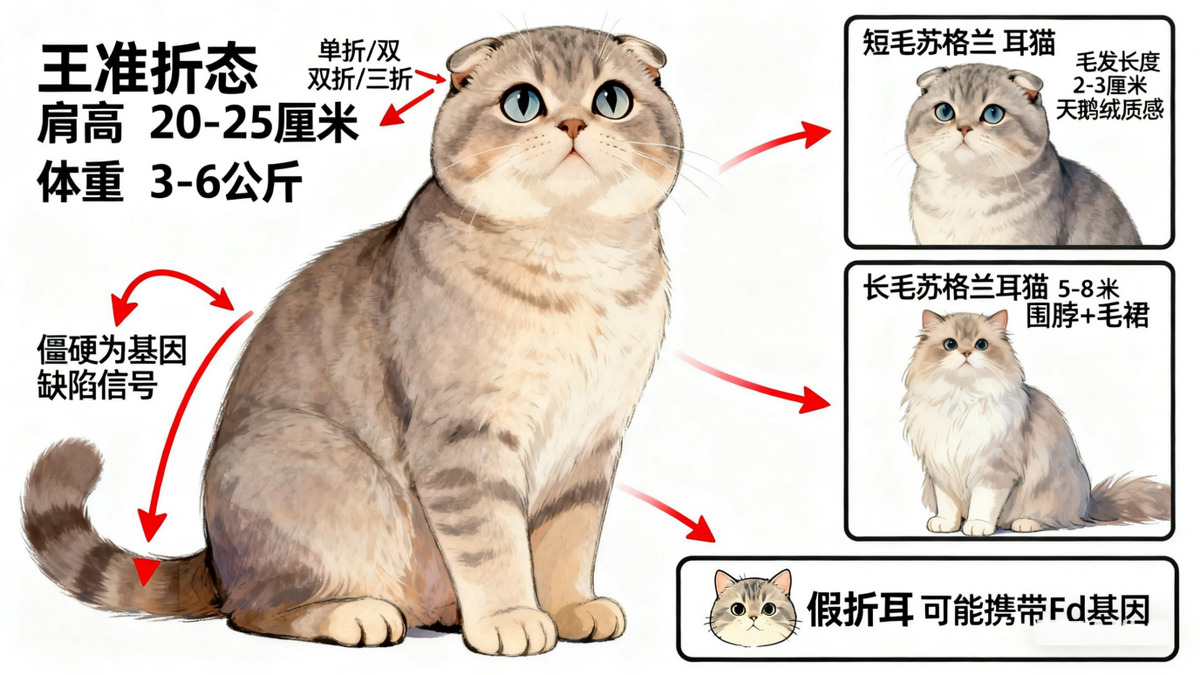 苏格兰折耳猫以 “圆润体态 + 折叠耳朵” 为核心标识,短毛(SH)与长毛(LH)的差异集中于毛发,共性特征则贯穿品种始终。