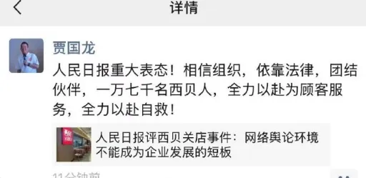 同时,人民日报也对该起事件作出评论,贾国龙也进行了转发回应。