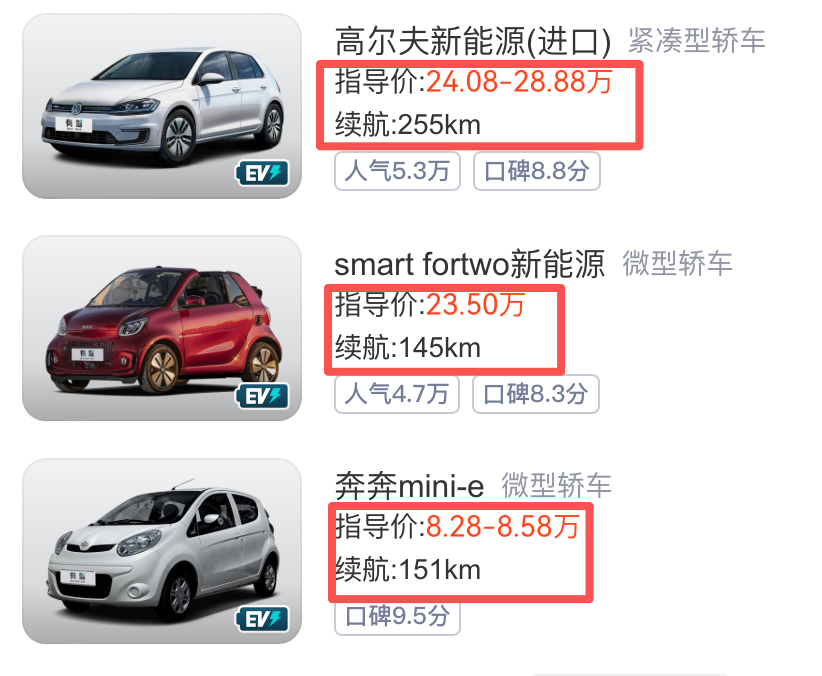 早期的电动化普及,主力是靠A00级纯电车,即便如高尔夫新能源(进口)这类紧凑型车型,那时的指导价也高达24.08-28.88万元,但续航仅255km。