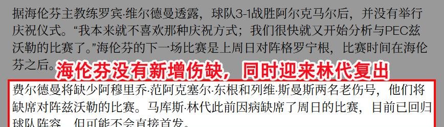 再看看对手海伦芬,简直是另一番景象。他们正处于赛季巅峰,上一场踢阿尔克马尔,被自家主帅认为是本赛季最佳表现。而且他们没有任何主力伤病,缺的两个人都是老伤号,影响不大。主力中场林迪伤愈复出,整体实力还稍有提升。