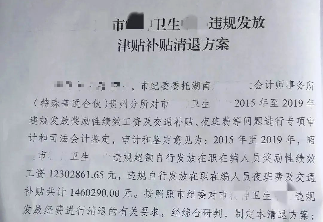 最终认定该市卫健系统在五年间“违规发放”在职人员奖励性绩效1200余万元、夜班费和交通补贴146万余元,要求限期清退。