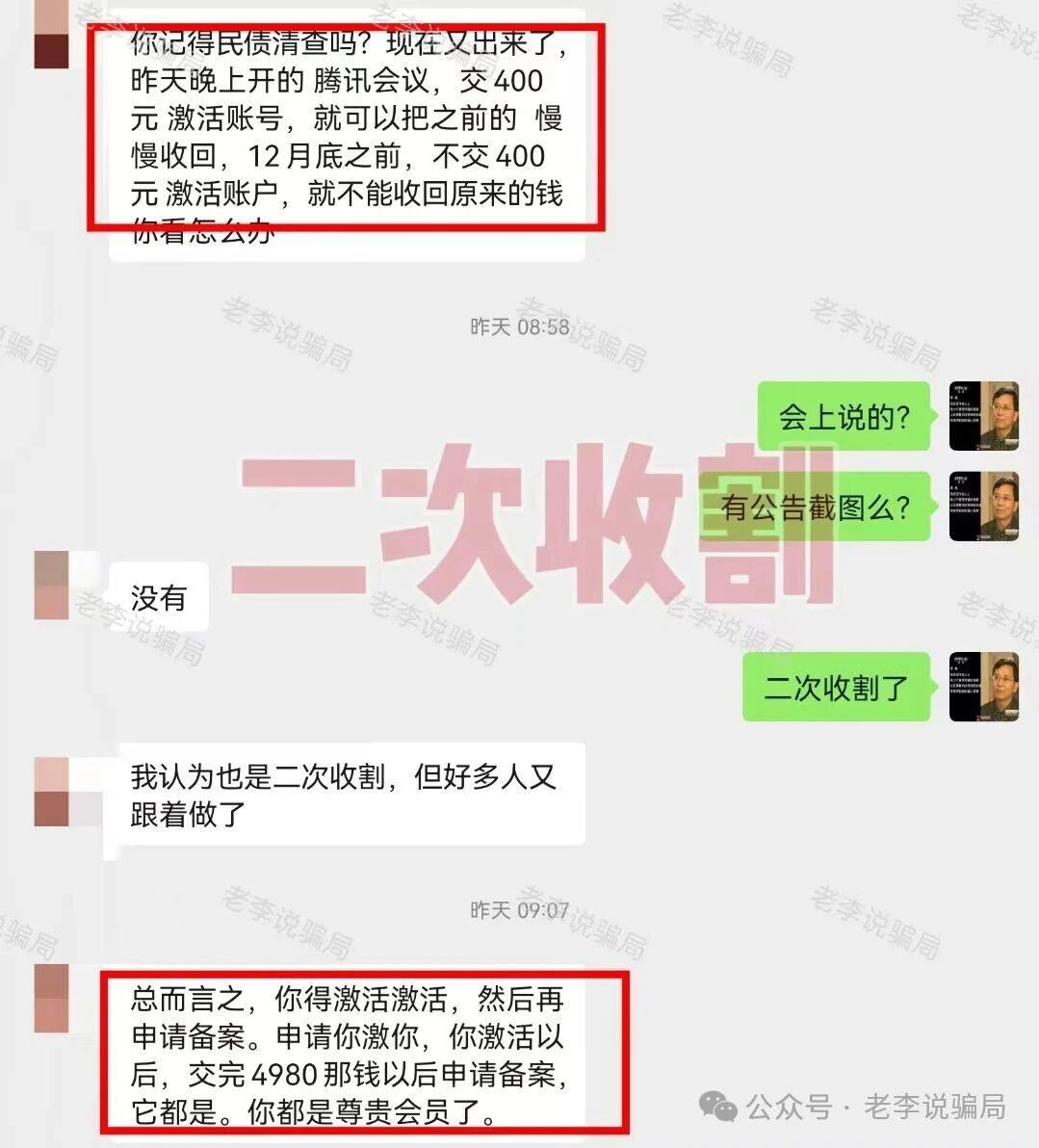 冒充“工信部”,打着“清债”的旗号,兜售虚假投资理财项目。声称12月初可提现,要求参与者缴纳400元“激活费”,并投资4980元申请备案。