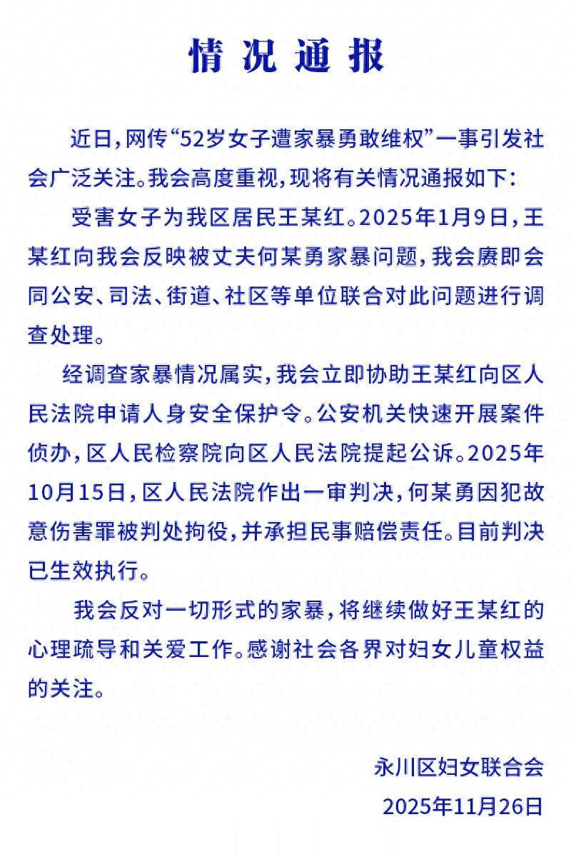 近日,网传“52岁女子遭家暴勇敢维权”一事引发社会广泛关注。永川区妇女联合会高度重视,现将有关情况通报如下: