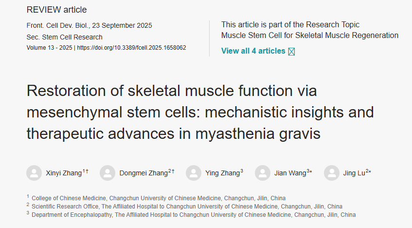 近期,国际权威期刊《Frontiers in Cell and Developmental Biology》刊载了一篇由中国长春中医药大学研究团队撰写的综述。该综述系统总结了间充质干细胞(MSCs)在改善骨骼肌功能以及干预重症肌无力(MG)方面的作用机制与研究进展。