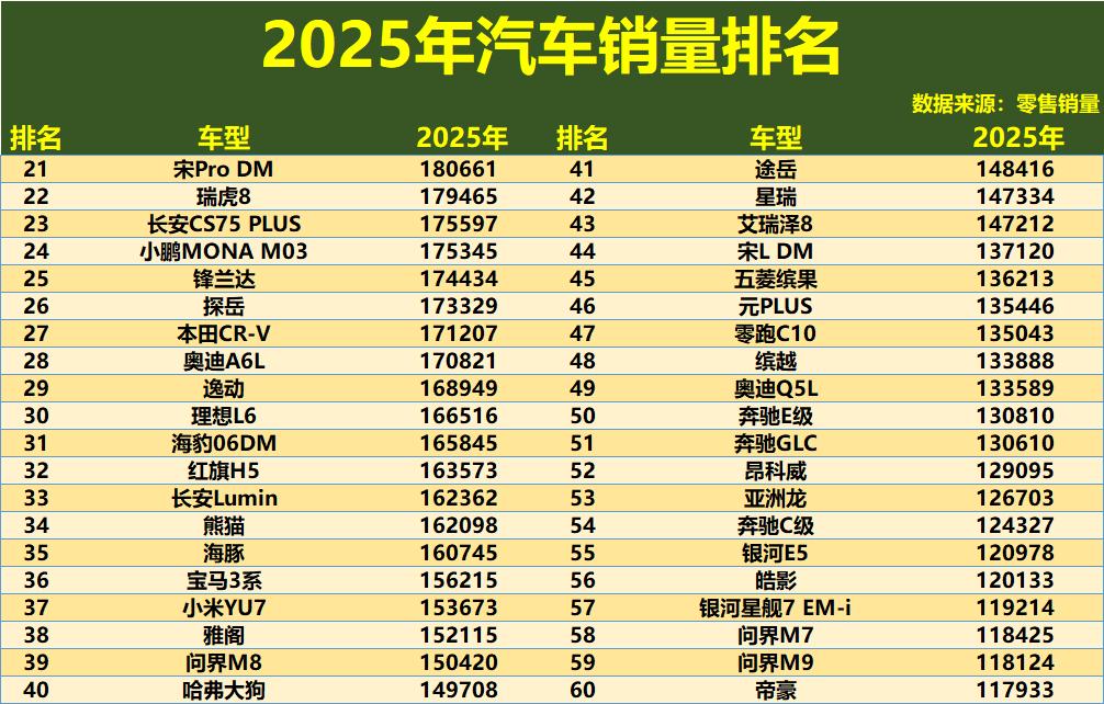第21至60名是竞争最为胶着的区间,年销量集中在12万至18万辆之间。这里云集了各个细分市场的“顶梁柱”和“实力派”。例如,SUV市场的主流车型瑞虎8、长安CS75 PLUS、本田CR-V;持续走量的新能源车型宋Pro DM、海豹06DM、理想L6;以及豪华品牌的奥迪A6L、宝马3系、奔驰E级。这个区间出现了不少“现象级”新车,如小鹏MONA M03年销超过17.5万辆,成功切入主流市场。同时,一些经典车型如雅阁、帝豪的排名相对以往有所下滑,而问界M8、M9等车型的双双入围,则显示了高端新能源市场的快速成长。