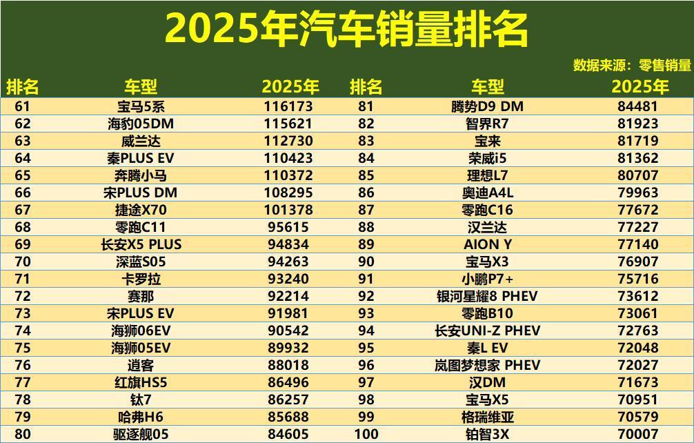 第61至100名的榜单,构成了市场多样性的坚实基座,年销量在7万至11.6万辆之间。这里既有宝马5系、汉兰达、腾势D9 DM这类在高端或细分市场表现稳健的车型,也有秦PLUS EV、宋PLUS DM、零跑C11等新能源阵营的重要力量。同时,大量个性化或新兴品牌车型在此涌现,如深蓝S05、智界R7、岚图梦想家PHEV等,它们或许尚未进入主流视野,但已凭借独特的产品力获得了可观的市场份额。