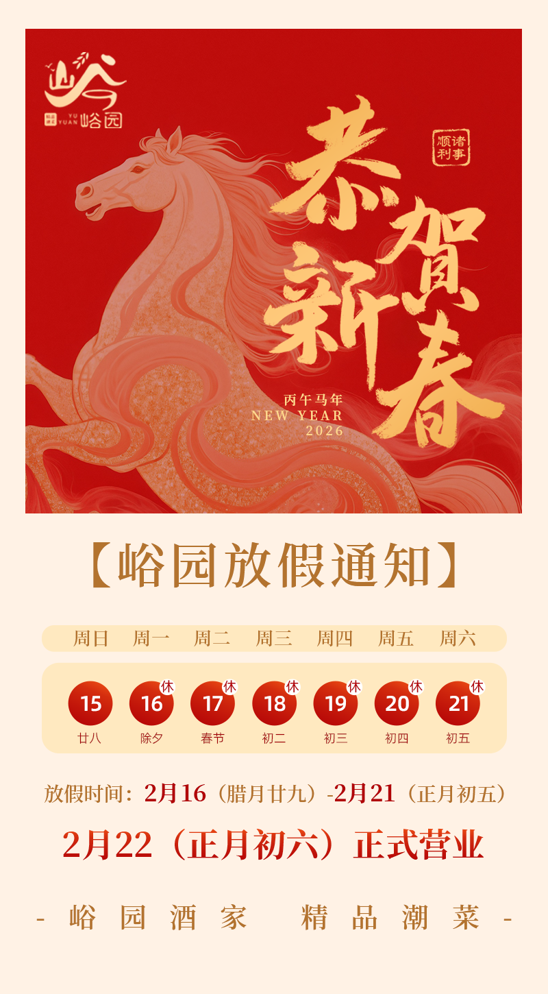 谢谢你把重要的时刻,托付给我们。新春将至,我们也要回潮汕老家,围炉守岁。2月16日(腊月廿九)至2月21日(正月初五),放假五日。