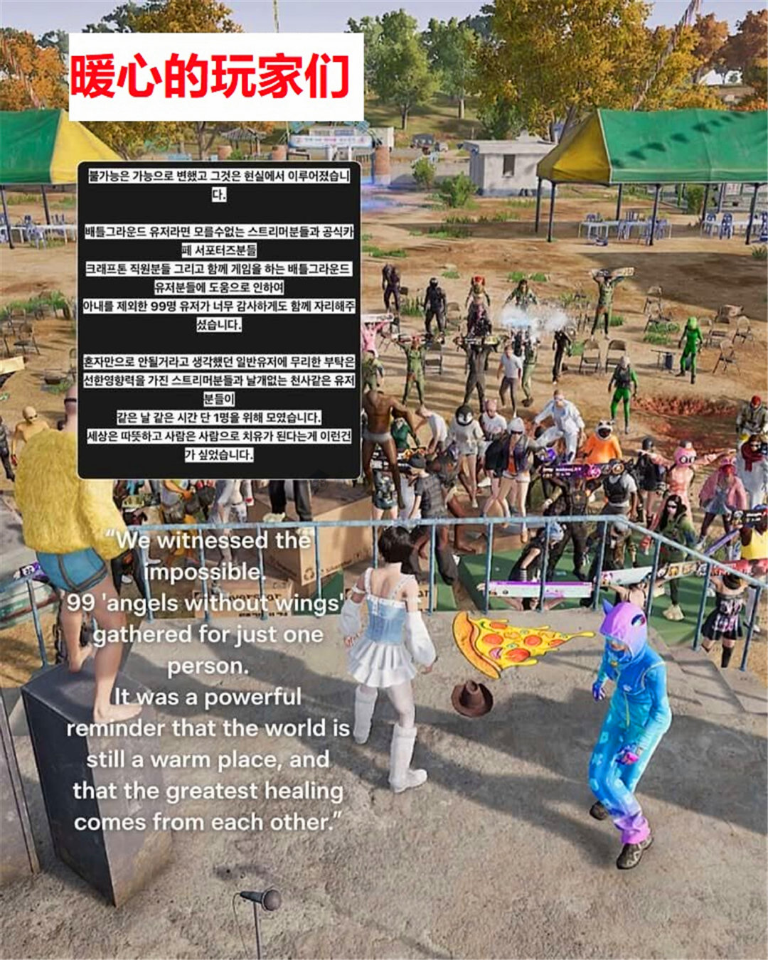 上述这种事情有人信,自然也有人在质疑,毕竟一些大作推出之前,类似的新闻蛮多的,凸显了部分游戏厂商的“人情味”。而今天,博士想来讲一个百分百真实发生的暖心故事,这一次不是开发商有人情味,而是玩家社群有人情味!正如标题所述,素不相识的玩家们聚在一起,在老牌人气游戏《绝地求生》中“演了一场戏”,只为鼓励和应援一位病患。