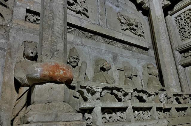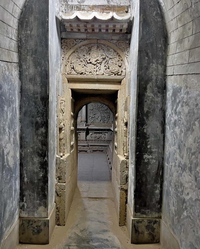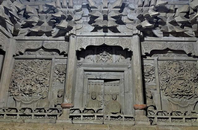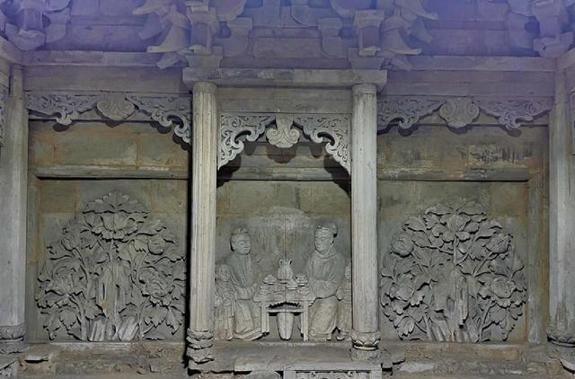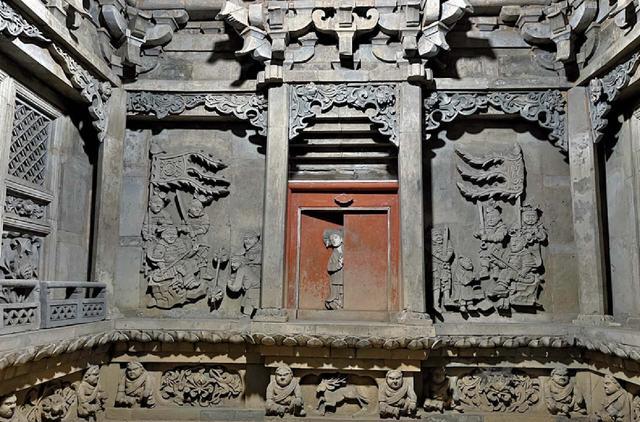 不过就是这蹲下和起立,抬头的几秒钟内,你会惊喜地发现一个精妙绝伦的砖雕艺术世界。头顶是仿木结构的砖雕斗拱飞檐,北面门楼,南面的话就是马村砖雕墓中最独特的遗存-妇人掩门图,我想但凡喜欢山西古建筑的朋友,对于这张图一定不会陌生。